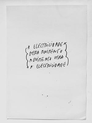 IL: Há muitos anos fui a uma visita guiada no CCB e fiquei fascinada. Nessa altura marcou-me muito o trabalho do Marcel Duchamp, A boite-en-valise, o Urinol... O facto de tu de repente pegares num objecto que, lá está, é completamente banal, e o transformares, o glorificares. Essa revolução que o Marcel Duchamp trouxe interessou-me muito. Essa ideia de te apropriares de objectos marcou-me porque foi a primeira vez que tive acesso à arte conceptual, que até aí não existia na minha vida. Houve também um trabalho que fiz que foi importante. Tive uma cadeira que se chamava Theories of Knowledge onde tive de fazer um trabalho teórico sobre um tema à escolha. Na altura gostava de provocar os professores e escolhi fazer sobre nada. Sobre o nada. Mais tarde apercebi-me que foi dos trabalhos que mais me marcou e marca ainda hoje. O nada é tudo... Descobri que os nossos átomos são 99,9% de espaço vazio - somos feitos do nada. Foi recentemente comprovado que esse espaço vazio é energia. Como é que as coisas surgem do nada? Sempre perguntei isto desde criança. Houve ainda uma peça que me marcou muito, que penso ter sido a Maria João Gamito a mostrar-me, que é do Robert Morris e se chama "The box with sound of its own making" - é uma caixa com o som desta a ser feita no seu interior. Ou seja, é um circuito completamente fechado - para mim essa peça tocou a tudo, é completa. Não há mais nada sobre aquela caixa. É aquilo. Na altura até fiz um projecto inspirado nesta ideia que era uma roda de uma bicicleta ligada a um motor, portanto, à electricidade, e esse motor fazia com que a roda girasse. Tinha também um dínamo que ligava uma luz com o movimento. Era também um circuito fechado. A electricidade gera movimento e o movimento gera electricidade.