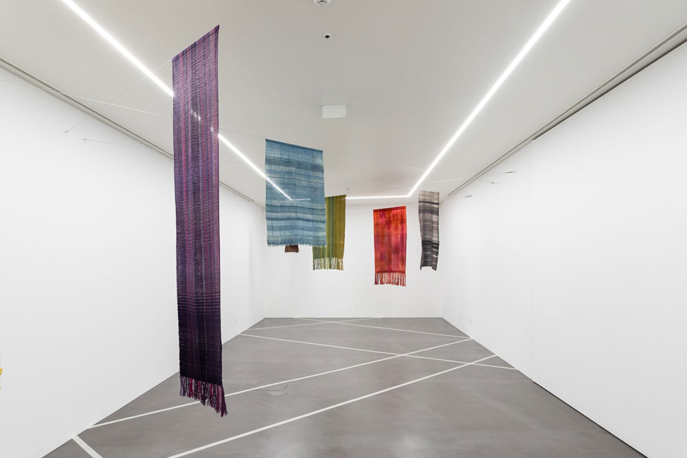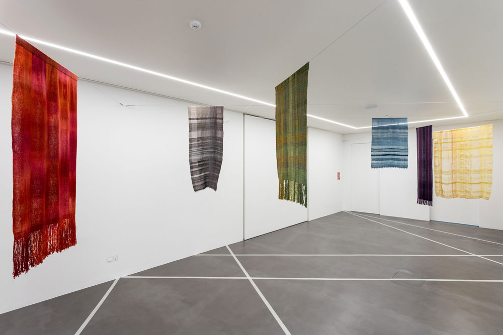 São 7 obras de cores diferentes, como se viu nas palavras da artista. São pinturas em tecelagem.