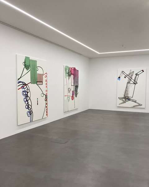 Ao entrarmos na galeria, somos surpreendidos por uma série de obras, coloridas e suspensas de fios de aço que as mantêm em diversas direções.