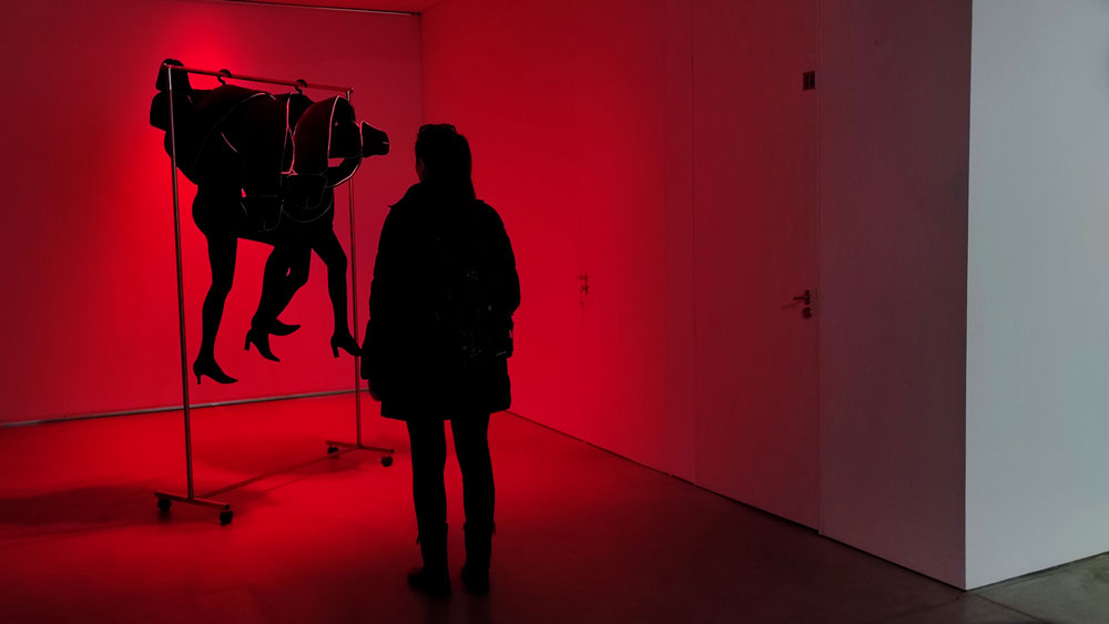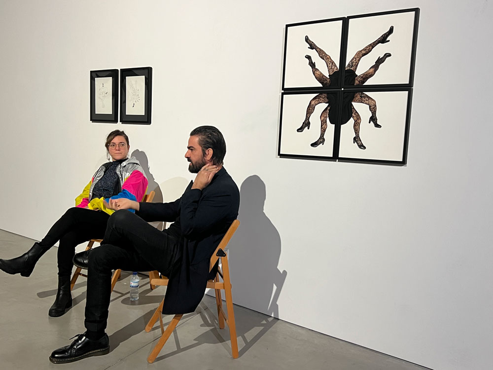 Então, essas noções surgem dos meus desenhos mais impulsivos até as minhas proposições mais conceituais e racionais em performances e demais linguagens. Indicador (2020) é uma peça resolvida como objeto cinético que veio de um caderno mais antigo de desenho, tomando forma no espaço como intervenção direta numa parede, e só posteriormente a isso tudo é que a obra foi solucionada. Essa peça carrega todo o meu repertório que veio antes, em que eu já exprimia o que vinha refletindo e investigando em torno dos estudos de gênero em O beijo (2006), O outro beijo no asfalto (2009), F2M2M2F (2015), e em outras várias ações realizadas antes e depois de Sissyparity (2019) até chegar em Pé 45 sem par (2020), Tucking (2022) e em outras concepções.