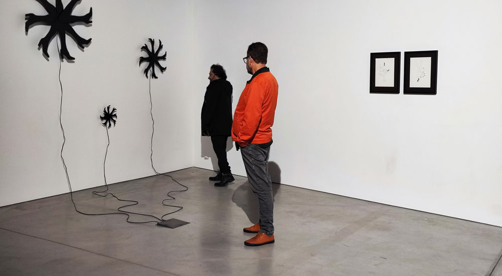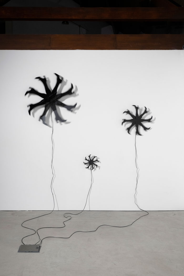 Enquanto a escultura foi aparecendo como necessidade de dar corpo a certos volumes que ficariam efêmeros e de que a documentação em vídeo e fotografia não dariam conta, alguns dos meus desenhos também têm ganhado configurações mais escultóricas – ou melhor definindo, mais objetuais –, onde transponho as formas para superfícies bidimensionais e rígidas e, depois, atribuo cinetismo a elas com auxílio de motores, dando-lhes performatividade por meio do movimento, mas, também, volumes no espaço.