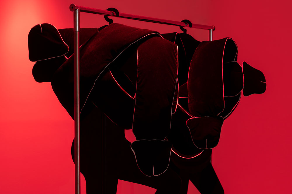 As formas geradas são sinuosas, colocam corpo com corpo, pele roçando em pele, então há sensualidade e erotismo até nesses trabalhos. Em uma apresentação que fiz de Conjunto Sensível (2018) – que consiste num saco de tecido elástico com zíper para até cinco pessoas entrarem juntas e conviverem pelo tempo que quiserem, sempre em movimento pelo espaço – eu escutei uma pessoa chamar a obra de “barraquinha do amor”, sugerindo que, dentro do objeto, pudessem ocorrer toques mais eróticos entre participantes. Essa leitura não foi minha, mas de alguém da audiência. Em Triunfo (2019), que é um par de luvas especiais para conectar dois corpos, eu simplesmente pensei em transformar uma situação conflituosa em um encontro harmônico, em que uma luta pudesse virar uma dança a par. Ao ativar o trabalho, entendi o seu inegável carater homoerótico.