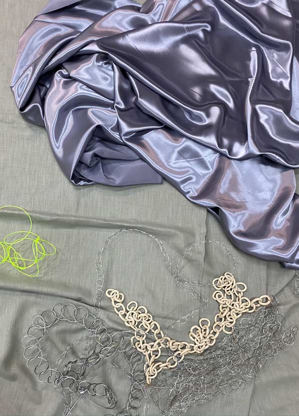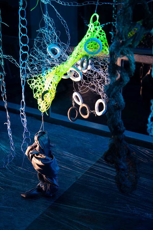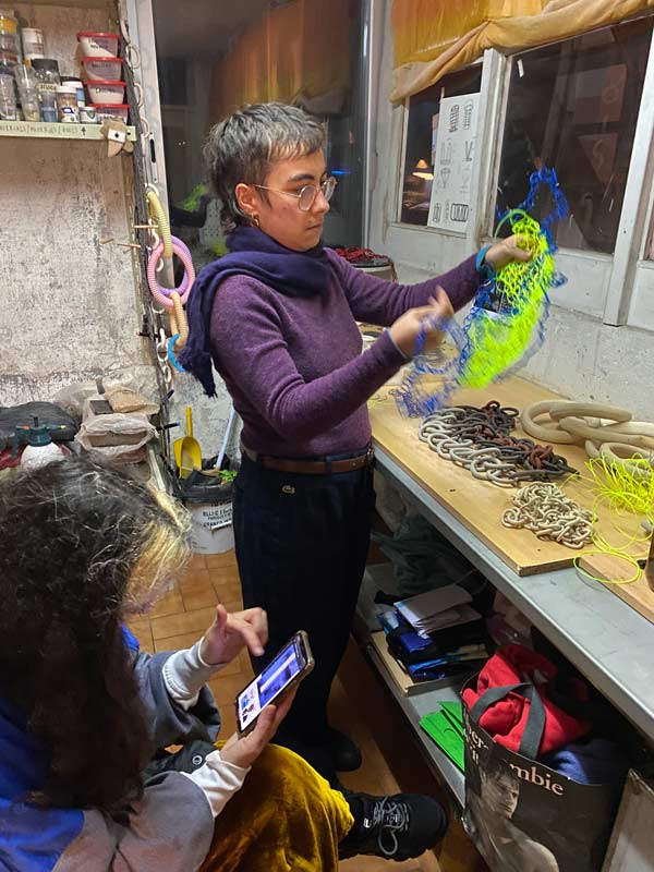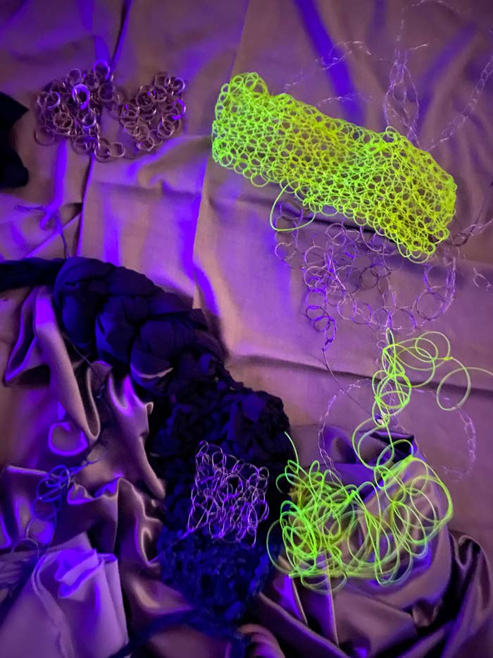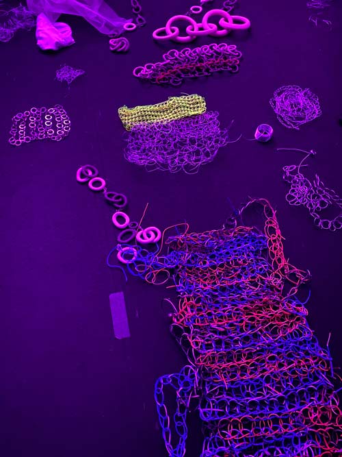 ARTISTES: Para além da cerâmica — material que eu (Rebeca) privilegio na minha prática, usamos diferentes tipos de fio metálico (para criar relação com uma performance que a Adriana já fez antes e que inspirou bastante esta colaboração, por ter tantos elos de ligação com o meu trabalho). Alguns plásticos e tecidos cintilantes chamaram a nossa atenção pela sua transparência e brilho. A partir do momento que iniciámos este crochet frenético, todos os materiais foram muito fáceis de seleccionar entre nós, pois, no momento da escolha, concordámos quase sempre nos quais preferíamos e chamavam a nossa atenção. A um nível mais prático, ainda na faculdade, em 2019, passei três meses a tricotar 180m cabo de aço (Adriana), de modo a construir uma pele que usei numa performance documentada audiovisualmente e instalada num espaço. Em 2021, estive em residência artística com Gabriel Siams e com Filipa Alves no EGEU, onde desenvolvemos uma peça composta por vários processos e materiais, incluíndo 170m de correntes, que, diariamente, íamos entrelaçando e desentrelaçando no espaço. Acabámos por fundir peças antigas nossas na instalação final — como a pele de cabo de aço e fragmentos de correntes de cerâmica — pensámos em como criar novas parcelas, fazendo crochet conjunto com materiais como metal e tecido.