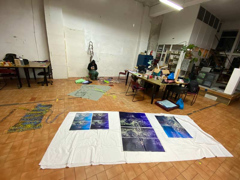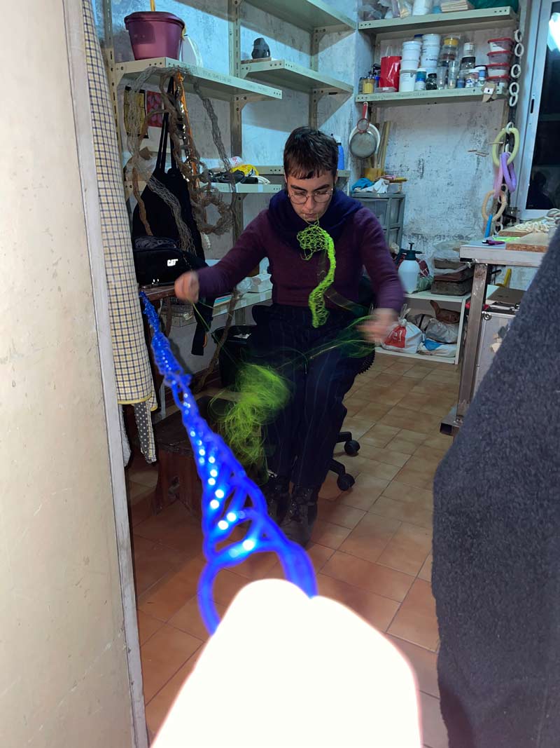 ARTISTES: Obrigade, pelas palavras. O comentário possível é que, com certeza, captaste a natureza do nosso processo e do resultado plástico e sonoro conseguido. De facto, esse foi o lugar que encontrámos de cruzamento entre as nossas práticas e que decidimos explorar. Entramar os nossos processos individuais num único, utilizando diferentes materiais (os que nos tocaram nos sentidos) com a calma e orientação que os movimentos repetidos que a manufactura destes objetos nos pediu. Algo, ainda que estático no enlace, que vibra num movimento aquoso e subtil. Falámos de múltiplas possibilidades, mas intuitivamente começámos por tecer tramas aquosas, a pensar acerca de ciclos, rituais, parcelas padronizadas e viscerais, que por questões temporais e de recursos se condicionam fisicamente.