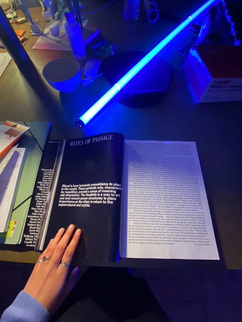 UMBRAL: Sempre que passávamos na costa do castelo, a vitrine do teatro era algo que nos sugava porque sentimos as suas potencialidades de transformação. Espaços como a Vitrine, com vários layers são para nós uma premissa de permeabilidade e de possibilidade de transmutação (na verdade qualquer espaço pode ser transmutável). No entanto a Vitrine “suspensa no tempo” e com a possibilidade de ser experienciada de diferentes formas e de diferentes perspectivas, começando pela rua da Costa do Castelo e continuando no interior pela sala de ensaios, que apenas é utilizada pelo Teatro do Bairro e pela Comunidade de idosos do mesmo, pareceu-nos o local ideial para pensar estas possibilidades. Há para além disto uma relação de ambos de carinho com o local — foram imensas as vezes que visitámos o café do Teatro da Garagem, onde antigamente (antes da mass touristification do mesmo) era um local perfeito para nos escondermos a ver a cidade, ler, trabalhar ou apenas conversar com amigos. Nas verdade a possibilidade de podermos ativar a Vitrine é algo simbólico e bonito porque a Vitrine “esquecida” faz parte de um lugar que por muitas vezes foi casa, estúdio ou sala de estar. Trabalhar a transmutação de lugares que também nos são íntimos de alguma forma é algo que nos interessa experienciar.
