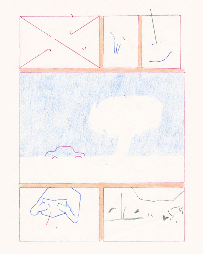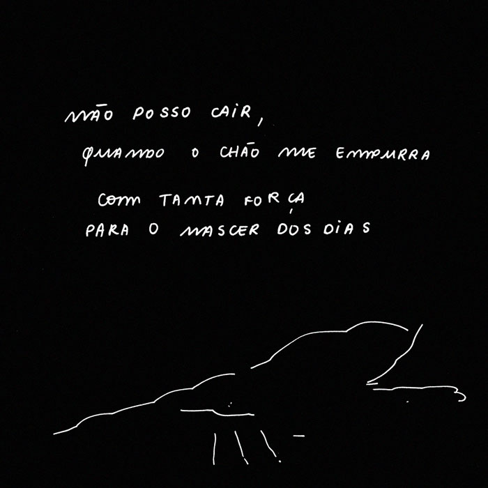 CR: O cinismo é o depois da raiva, quando se aceita resignado... e nesse seguimento tenho duas coisas a dizer. Infelizmente só vi a documentação de “Peguei Fogo ao Céu”, contudo esse projecto aparenta ser tudo menos raivoso. Por outro lado, e pensando nos teus textos, apontei que a experiência do carinho (ou de eu sentir que enquanto leitora havia a presença de um carinho no texto) era contrabalançada com, mais do que raiva, uma sensação de insegurança e de perda. Era um contrabalanço que se repetia. Nos teus desenhos, o ciclo de esperança e de cinismo, nas palavras em que o colocas, ou de carinho e insegurança como o coloquei, veem-se.