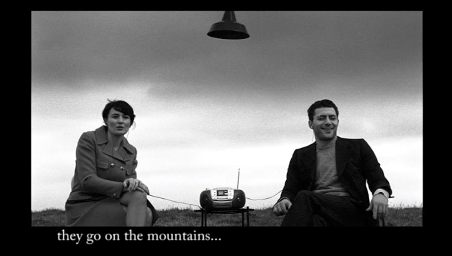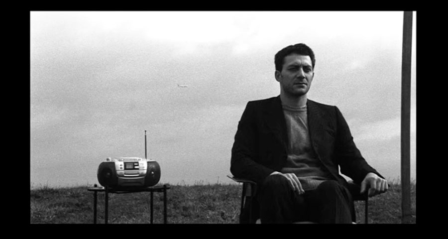 LF: O teu primeiro filme, La Camera, aparenta anunciar os jogos de figuras e contrafiguras do cinema que se tornarão o fio condutor de todo o teu trabalho. Neste filme, realizado em película 16mm a preto e branco, vemos dois actores no topo de uma colina, enquadrados numa rudimentar estrutura de madeira que desenha a perspectiva de uma sala, a debitar alternadamente textos de cariz pessoal sobre a experiência da televisão e dos seus conteúdos. O andamento das suas falas é particular, a mulher e o homem têm headphones nos ouvidos e um leitor áudio na mesinha que os separa. Aparentam transportar a expressão de um texto que, provavelmente, não lhes pertence enquanto sujeitos.