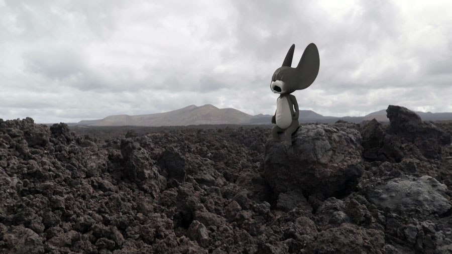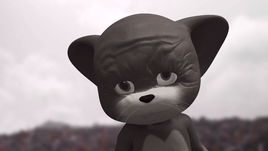 RdM: Os meus últimos cinco trabalhos são todos em animação digital. Na selecção deste programa em Lisboa viram apenas um, Poor, Poor Jerry (2017). A animação dá-me uma grande liberdade, porque posso criar tudo o que imagino, é como desenhar, posso sair da realidade. Este é o meu filme mais empático, no trabalho conceptual sinto-me mais destacada, com Jerry estamos mais junto dele e é engraçado porque ele é uma figura completamente falsa. Jerry, o rato de Tom & Jerry, move-se numa paisagem real, no deserto de Lanzarote, que é todo negro, vulcânico. Ele está nesse outro mundo ou num pós mundo. Envelhecido e gigante, cansado e cheio de rugas, deambula como uma espécie de detrito e transporta todos os diálogos de amor dos media do mundo. Um patchwork de breves citações, em que uma frase entra e se transforma noutra, todos os “I love you”. São trechos autênticos, acelerados, que criam um monólogo único. De vez em quando Jerry é também obrigado a cantar.