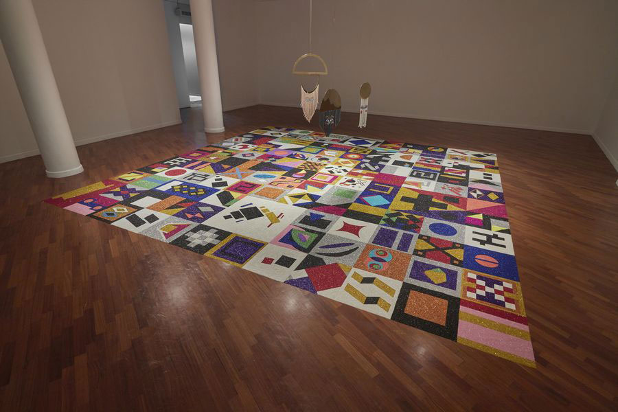 LFL: Podias contar-me como ocorre a escolha de materiais precários na fabricação das tuas peças – cenários construídos com papel, cartão e MDF; nos desenhos feitos com marcadores; os tapetes confeccionados com purpurina colocada directamente e sem adesivo sobre o chão; ou o uso de lantejoulas em teares e aplicações? Tudo isto leva a uma reflexão acerca da simulação.