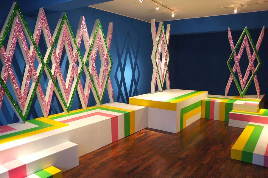 FR: Durante os meus últimos anos na escola de artes senti o impulso de fazer grandes obras usando materiais e maneiras de trabalhar que se afastaram de um tipo de produção que eu considerava muito 'masculina’. Para fugir do ladrilho e do cimento, que estavam na moda na época, recorri a materiais nos quais predominava a cor. No início, tive que procurar opções que pudesse pagar: em vez de usar luzes LED, utilizava papéis ou plásticos de cores translúcidos, por exemplo. Aos poucos fui construindo e aperfeiçoando uma linguagem muito pessoal baseada na escolha de materiais específicos e esta linguagem foi-se vinculando organicamente ao meu discurso. É sempre um desafio (que eu acho emocionante) transformar materiais, normalmente utilizados para decorar ou fazer manualidades, e conseguir que se sustenham numa instalação de grande escala dentro de uma sala de exposições.
