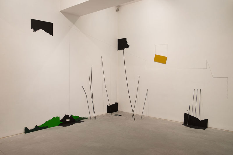 ‘Pensei em criar uma grelha: os desenhos têm um suporte que é a folha de papel, e eu criei uma base, que seriam estas estruturas de madeiras e assim combiná-las em situações que parecem mais uma espécie de biombo (...) [mas assim] posso desenhar quando estou a montar a exposição, as peças são pouco fixas.’ [4]
