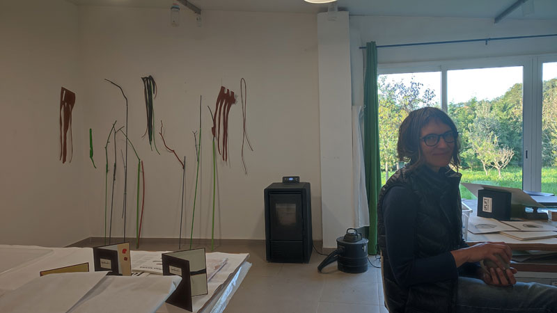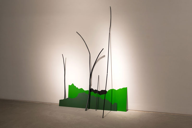 ‘Talvez dar outro ângulo, outra leitura às esculturas. As esculturas estão no universo das plantas, e os desenhos no universo da geologia, do solo, portanto também fazem a ponte para o habitat. Nas esculturas, há um material que já é artificial, e depois há a madeira que é artificializada, portanto eu não estou a tentar mostrar a madeira, estou a esconder a madeira, e depois parece plástico.’ [7]
