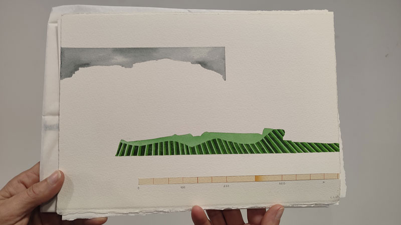 Também na série Orografias exposta em Naturafatura, isola esquemas paisagísticos baseados no grafismo da estratigrafia, orografia, topografia, pedologia e geologia, e os seus elementos, assim como a introdução de elementos 3D, ainda que mais subtilmente. ‘Nestes desenhos estratigráficos, eu uso os cortes e os vincos, estou a trazer o desenho para o campo tridimensional de uma forma muito ligeira, ao introduzir a grossura do papel. Depois comecei a fazer estudos com embutidos, se isto encaixar bem fica muito interessante, é uma colagem, mas fica tudo à mesma superfície.’ [5] Esta relação, ‘da mesma superfície’ entre o desenho e a escultura é vistosa e estridente na sua exposição Paisagem Instável de 2017, na Carlos Carvalho. Michael Auping descreve em A Nomad among Builders que ‘há algo venerável acerca do nómada, movendo-se pela superfície do planeta sem necessidade de tomar possessão dele’. [6] Há uma certa leveza e sucinticidade presente no trabalho de Catarina que me transporta para uma dimensão onde através dos materiais ilusórios que escolhe, nos relembra que a atividade humana neste planeta é real, mas não precisa de ser barroca e decadente.