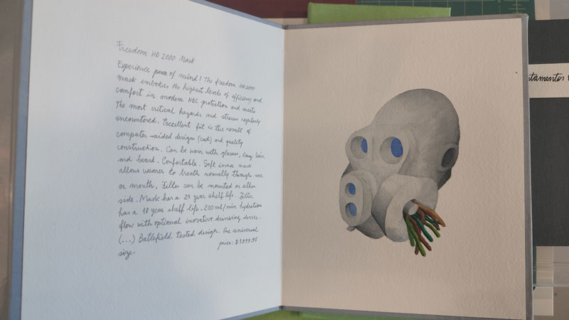 Este ‘noutro lugar’, ou mais precisamente, o que há noutro lugar, sente-se em alguns dos seus trabalhos como o objeto de desejo. Para mim, há um motivo subconsciente, ou até inconsciente, no trabalho de Leitão que é a noção de povoamento enquanto ato recíproco entre natureza e o que consideramos antropogénico. Enquanto falava com ela sobre o trabalho escultórico da exposição Naturafatura que esteve patente este ano na galeria Carlos Carvalho com curadoria de João Silvério, disse-me despercebidamente que as esculturas ‘povoavam a galeria’. Ainda que não considere estas esculturas animadas, já o seu trabalho Systema Naturæ é implicitamente vivo: um cardápio de espécies inspiradas pela taxonomia botânica, completamente desarranjadas na sua constituição material e formal devido à sua génese artificial, geram dúvidas relativamente a onde estas se encontram, a que sítios povoam. É dentro de aventuras botânicas como as que este livro algo surreal nos apresenta, que imagino sempre a cientista(-artista) de lupa em punho na realização de trabalhos de campo repletos de recolhas, catalogações e arquivos multicores. Esse é um momento em que o humano povoa o selvagem temporariamente, como se uma fronteira ultrapassasse. Em 2013, Catarina fabricou um Atelier Portátil onde todos os objetos necessários para a sua prática de desenho podem ser levados para o ar livre. No entanto, este sítio torna-se numa ilusão, pois o sítio onde esta instalação foi realizada é um território agrícola e não selvagem. Que sítios selvagens ainda podemos encontrar? Como é que eles se parecem? Como se distinguem de espaços naturais povoados pela nossa história? Equipada com a sua parafernália técnica, Leitão descreve: ‘A bata/vestido funciona ela própria como contentor/atelier com bolsos especificamente desenhados para alojar objetos e materiais.’ [3] Até nas suas batas, moram povos técnico-artísticos!