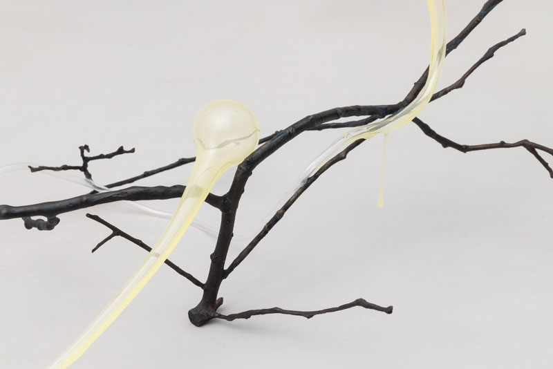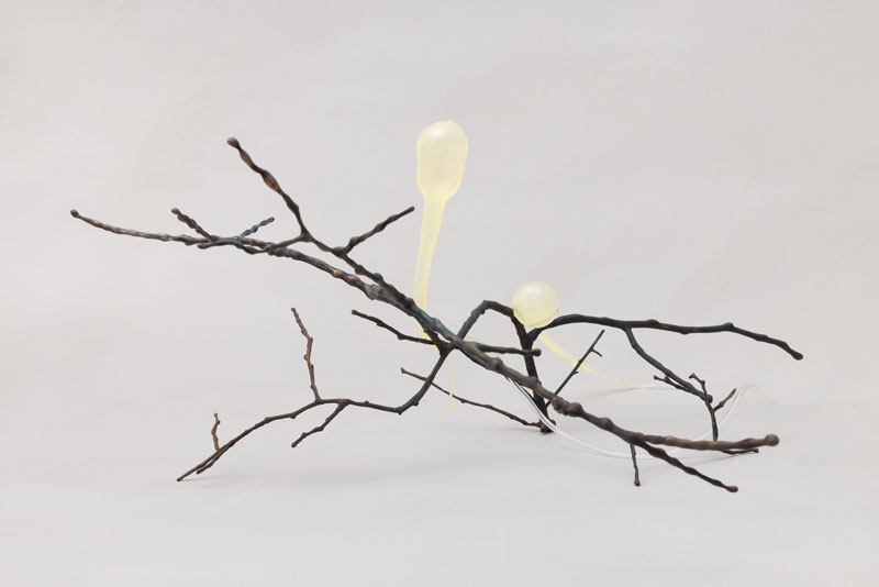 Inês tem estado a estudar uma série de microrganismos no seguimento da sua pesquisa para o trabalho que realizou para ‘Portais do Tempo’, ‘Social Ameba’. As amebas sociais são organismos unicelulares que quando ‘passam por escassez nutricional, (...) forma[m] uma coletividade, um organismo conglomerado que passa por vários estados: vegetativo, agregação, migração e culminação. Criada esta lesma multicelular, o grupo transforma-se numa torre produtora de esporos, um farol projetor de amebas para áreas mais nutritivas. Este processo de transformação implica o sacrifício de algumas células em prol da coletividade. Observamos por isso, renúncia e solidariedade neste modelo de vida social microscópica.’ [4]4 O trabalho de Inês é para mim, claramente adequado a ser desdobrado num discurso bio semiótico. O comportamento deste organismo produziu uma experiência estética, e Inês interpretou-a como uma escultura em vidro, bronze e silicone pigmentado.