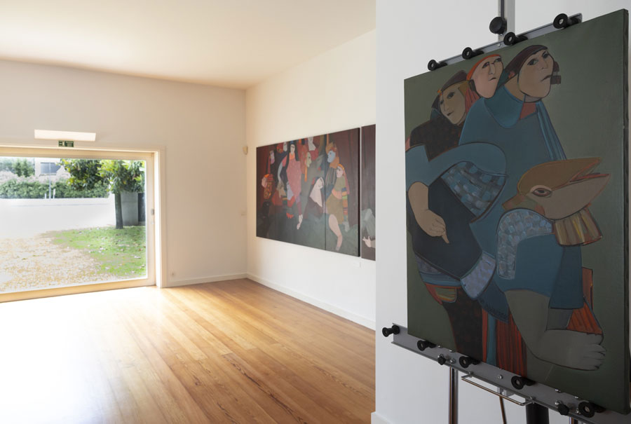 FP: A minha Mãe era amiga do arquitecto e sempre a ouvi dizer que a Arquitectura é frágil. Não se deve acrescentar nada sem consultar o autor. Por isso, para esta exposição, como precisei de incluir uma parede para pendurar um friso de telas, fui buscar o arquitecto e fotografei o momento a desenhar na ‘Casa Armanda Passos’, pela primeira vez sem o diálogo com a minha Mãe.