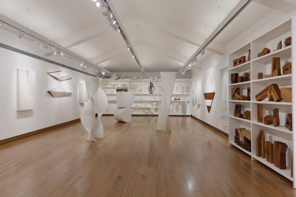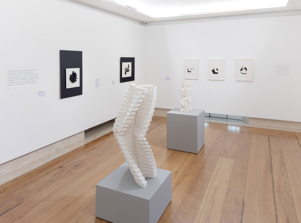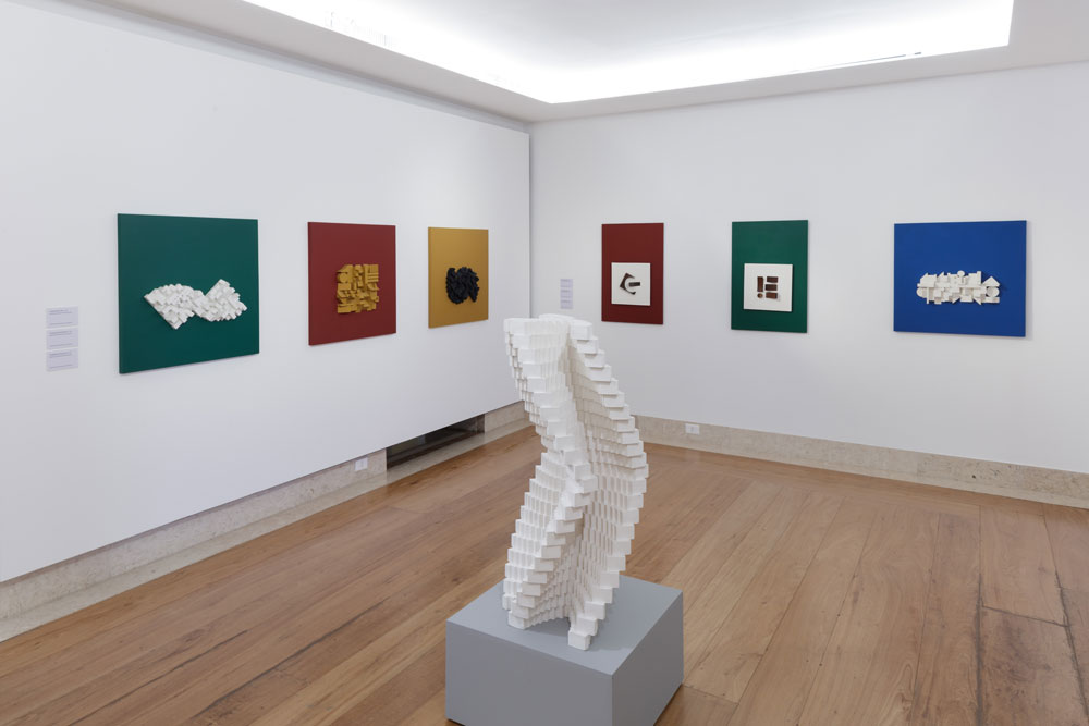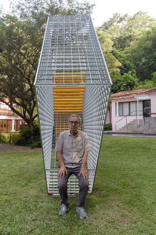Decidi ser escultor, quando ingressei na Escola Nacional de Belas-Artes, mas a minha escultura tem muita influência da arquitetura. As peças expostas na Casa Roberto Marinho, no Rio de Janeiro, que visitou, principalmente, as dos jardins, têm forte influência da arquitetura. Até aos anos 80, trabalhei na madeira pintando-a de branco, pela questão da luz e sombra. Depois, passei a trabalhar a madeira pura e, em 1983, me chamaram para criar uma escultura para um espaço público. Não podia ser de madeira, mas de ferro, aço ou alumínio. No ferro e no aço tem de se usar solda, enquanto para fixar o alumínio, utilizo parafusos e porcas. A partir do alumínio que entrava em barras de seis metros no meu atelier, eu cortava e furava. Esse contacto com este material foi fundamental. Atualmente, só crio peças com alumínio, especialmente, as esculturas. O alumínio é também um material muito usado na arquitetura. A partir da escultura de 1983, passei a usar só o alumínio, um material que me abriu muitas opções. Hoje, 2025, continuo a fazer peças novas. Na exposição “Geometria Inquieta” apresento três peças recentes, que realizei em 2024. Vou todos os dias ao meu atelier, onde trabalho com quatro jovens que foram treinados por mim para me ajudar a montar os meus trabalhos. Durante os primeiros dez anos, fui sempre eu que construía inteiramente as minhas peças. Uma das que você viu à entrada foi concebida para uma exposição no MAM-Museu de Arte Moderna do Rio. Geralmente, faço os estudos, planeio, faço maquetes, pinto e, a partir disso, vou ampliando a escala. Em Lisboa, tenho peças na coleção Manuel de Brito e no hall de entrada na Culturgest.