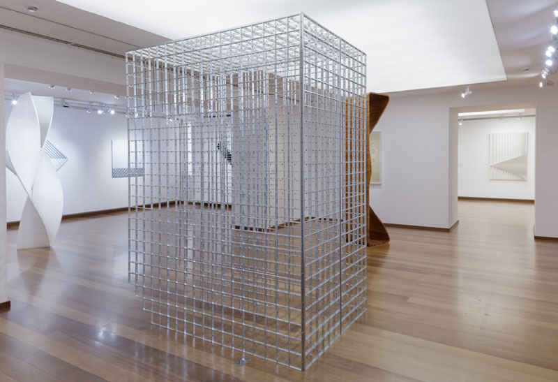 AMMM: Quando visitava exposições em museus, reparava sempre na indicação: “não tocar nas obras”. Era algo que me incomodava muito, a imposição de manter as pessoas muito distantes do objeto artístico. Então, em 1969, estava a montar a minha série “Quadrados” quando criei as “Caixas”, nas quais os quadrados situados na parte superior da caixa em forma de cubo podem ser movimentados pelos visitantes, formando diferentes figuras geométricas. Então, na montagem da exposição “Geometria Inquieta”, dei a ideia de criar uma sala com peças que as pessoas pudessem tocar e manipular. Sempre gostei da ideia de as pessoas tocarem nos trabalhos, criando uma empatia com a obra. Na mesma sala interativa, também estão as Caixas 1 e 2 (Quadrados) e 3 e 4 (Triângulos), com tamanhos crescentes e móveis, que podem ser manipulados.