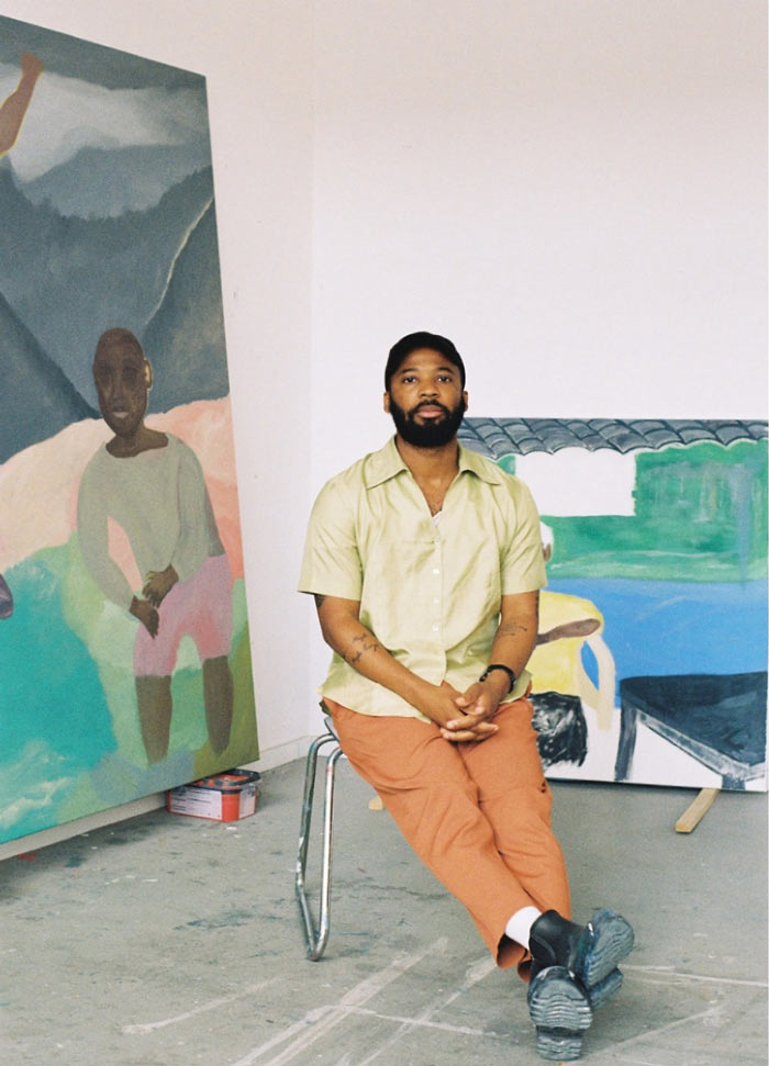 Carlos Carima (1995), é pintor, performer, um artista que se expressa através do estudo da cor, pela elegância dos corpos negros em descanso e a ancestralidade que os atravessa — compreendendo, no fundo, a natureza que envolve tudo isso: que é viver.