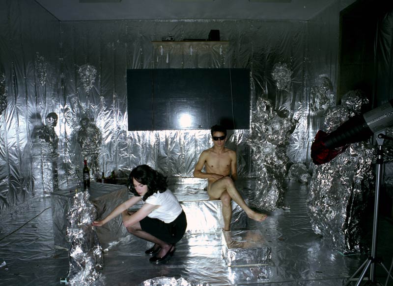 Há uma segunda cena sobre os pais que satiriza a famÃlia e o seu meio. Passa-se numa galeria de arte, forrada de papel de prata, em referência ao atelier do Andy Warhol. O pai, um homem de negócios, está a investir em infraestruturas no Iraque, e lucra com a guerra. Quando a filha descobre a verdade sobre os negócios do seu pai, ela deixa de acreditar na sua missão e na Democracia. Os filhos do casal acreditam que só vale a pena lutar pela democracia no Iraque, o que vejo como um pensamento ultra-reaccionário, mas idealista ao mesmo tempo. O terceiro capÃtulo passa-se no Iraque (representado numa instalação no terceiro andar da galeria). Para esta instalação criamos uma paisagem desértica, recorrendo a materiais simples como sarrapilheira, cola e areia. Cada uma das instalações tem as suas referências diversas a modos de criação: a primeira instalação refere-se a arquitectura pós-moderna, a segunda instalação refere-se ao ‘Factory’ do Andy Warhol e à arte contemporânea, e a última refere-se a uma versão low-fi da ‘land art’. Estas instalações, criadas na galeria, serviram de décores de rodagem para o filme. O filme é narrativo, e cada capÃtulo está projectado à frente de cada instalação aonde foi filmado. As projeções funcionam como um espelho cinematográfico da instalação. Escrevemos o guião pensando numa transferência de estereótipos americanos para Portugal. Por detrás deste projecto está a ideia de um imperialismo cultural americano, que está infiltrado por todo o mundo.