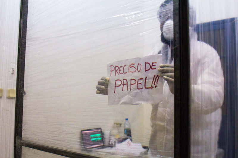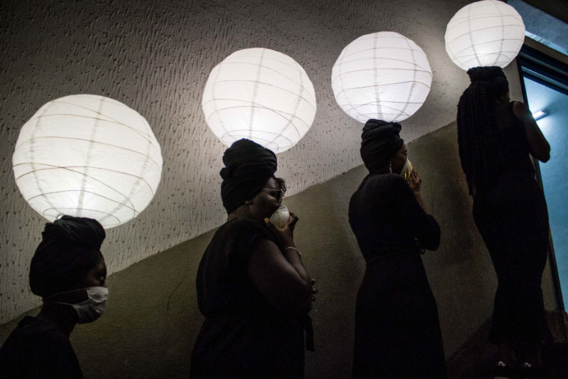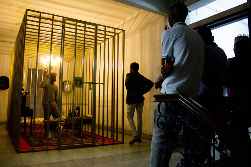 E não é difícil reconstruir o percurso que fizeram: a viagem começa no corredor do primeiro andar, à direita, onde a instalação de Toy Boy sugere que o conforto pode estar em qualquer lugar ou em sítio nenhum. Abrindo um caminho no silêncio das nossas dúvidas, Silence convida-nos a explorar corporalmente – apalpando, se encostando ou vendo – onde se encontra este lugar. Uma performer com burka entre aquelas almofadas é das imagens que nos ficarão na retina. À esquerda, no mesmo andar, um personagem se debate com a ausência de narrativas internas na curta-metragem Enóquio que não tinha coração de Ery e Evan Claver, que mergulha nas profundidades da alienação mental, retratando as experiências de um jovem desamparado que erra, sofre e se redime na atmosfera frenética das altas horas da noite. No segundo andar, a primeira paragem é no átrio, ante a instalação de Mussunda N’Zombo, onde, ao longo dos 7 dias da exposição, o espectador poderá rodear a proverbial ‘gaiola dourada’ e acompanhar a encenação de todos os estágios do encarceramento de um dirigente corrupto em Nguvulu, Marimbondo. Desafiando as nossas percepções do bem e do mal, personificando os vícios, o absurdo, o paradoxo, a soberba e a masculinidade tóxica do mundo dos homens poderosos, a performance vocaliza a mentalidade voraz dos acusados, disseca o tratamento judicial desses casos e a volatilidade da opinião pública perante os ‘prisioneiros de luxo’. Em seguida, o espectador pode escolher se vai para a direita ou para a esquerda. À direita, o percurso inicia no quarto 223, onde Melancholia, a delicada instalação de Keyezua, aborda a questão da sexualidade feminina durante o acto sexual, olvidada pela primazia do pénis, que domina o acto em detrimento do prazer sexual da mulher: a sua instalação é uma metáfora subtil que podemos não entender imediatamente. No 224, Yola Balanga encena silenciosamente o acto de lavar poucas horas antes a roupa escolhida como ‘a eleita’ para vestir, relativizando as propagandas governamentais ao Sukula Zwata (Lavou, Vestiu), usando o acto e o tanque de lavar roupa como meios de crítica às desigualdades sociais e o fracasso das políticas do governo para a sua resolução. Mas é, sobretudo, a presença dos tanques de lavar de cimento nos quintais dos bairros suburbanos ou, muitas vezes, nas varandas dos prédios da cidade, o elemento que contém a memória da vida de muitas famílias.