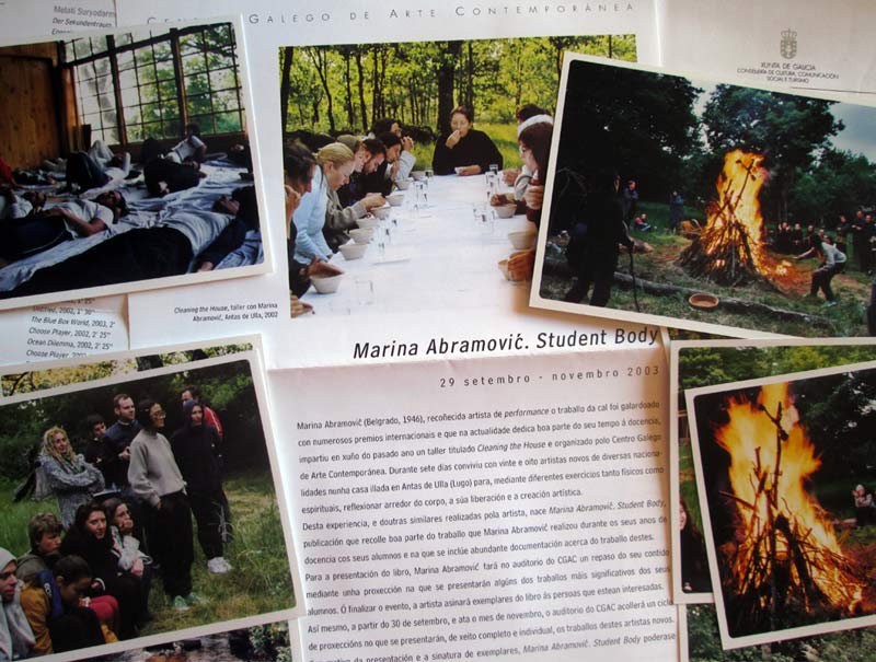Marina Abramovic nasceu em 1946 em Belgrado, Jugoslávia, agora Sérvia. É uma artista e performer incontornável, tendo sido apelidada de Madrinha da performance. [1] Sendo eu uma das suas alunas, sempre senti que éramos como as afilhadas dela, os filhos da arte que ela apadrinhou devido à sua capacidade inata de mentora. Sempre a admirei como artista e tive o meu primeiro contacto com ela em 2002. Foi a primeira vez que veio à Península Ibérica para realizar o seu workshop, criado em 1990, com o nome “Limpando a Casa” (Cleaning the House) no Centro Galego de Arte Contemporanea (CGAC). Nestes workshops, os exercícios criados por ela (o chamado método Abramovic) têm como objectivo libertar cada um para “limpar a sua casa”. Encontrar um estado puro para criar e transmitir a arte, chegando a um estado de clareza mental e uma recepção absoluta, centrando-se num corpo “limpo” como único veiculo da criação artística. [2] É importante contextualizar que em 2002 o ensino oferecido sobre performance arte era limitado. Em Portugal, uma licenciatura de ensino superior demorava cinco anos (Pré-Bolonha), com disciplinas obrigatórias, com currículo rígido e muitos exames. A performance arte era uma forma de arte sem destaque, sem disciplina, classe ou curso, sem um departamento ou área de foco numa licenciatura em Portugal. Não devemos confundir com dança, teatro ou animação cultural, que tinham maior destaque. Nesse período existia muito pouco ensino oferecido focado na performance arte mesmo no mundo inteiro. Apenas era leccionado um pequeno curso no Reino Unido e nos Estados Unidos existiam dois mestrados no ensino superior. O mais conceituado e competitivo, com o seu próprio departamento de performance arte, sem ser dança, teatro ou ambos, era o The School of the Art Institute of Chicago (SAIC). Este mestrado era limitado entre seis e oito alunos e demorava dois anos a completar, mas possuía o ranking mais alto do ensino superior no catálogo impresso “U.S. News & World Report”. [3] Na Europa, esporadicamente, existiam uns workshops como o de Esther Ferrer, em 2001, e os de Marina Abramovic, “Limpando a casa”. Na Hochschule für Bildende Künste (HBK), em Braunschweig, na Alemanha, Marina Abramovic tinha uma masterclass, onde desenvolveu a maioria da sua prática pedagógica (1997-2004). [4] Em diferentes alturas do meu percurso artístico eu experienciei, em todo o seu esplendor, o método Abramovic e a sua pedagogia pela mão da própria: Neste texto vou focar-me na pedagogia implícita na experiência dos exercícios criados por ela, que iam de encontro às necessidades de cada um de nós. Abramovic é uma professora que tem grande empatia e ternura por todos, como se fossemos uma planta que ela ajuda a crescer através da partilha da sua sabedoria para libertar todo o nosso potencial. Nas suas próprias palavras, “O meu papel como professor é ensinar os estudantes a confiarem em si mesmos e a canalizarem a sua energia… Não vejo o ensino como um monólogo mas sim vejo-o como um diálogo… Como professora, espero ensinar aos meus estudantes qual é a direcção que devem seguir com o seu trabalho. Espero ajudá-los a se realizarem em pleno como artistas.” [5] Existe um balanço entre o físico e o mental/espiritual nos seus workshops. Não se limita a criar as regras, ela segue-as ao nosso lado. Como as de não comer ou tomar banho a não ser de água fria. Só a regra de não falar é que é a única excepção, porque existe a necessidade de nos dar as instruções necessárias para os exercícios. Desta forma, cria-se uma comunidade que de repente está em grupo a beber chá frente a uma fogueira no crepúsculo de Antas de Ulla (Lugo, Espanha). Nas palavras de Abramovic “(…) coloca-me perto de cada participante, como se se tratasse de uma família. Espero e creio que todos os participantes nos workshops saiam com um sentimento de unidade.” [6] Um dos exercícios mais presente na minha memória é o de escrever o meu nome, sem tirar a caneta do papel, durante uma hora (Writing the Name Exercise). [7] Este exercício foi realizado pela primeira vez pelos alunos no primeiro dia do workshop. Pessoalmente, este exercício foi bastante difícil, porque todo o meu pensamento girava entre manter e mover lentamente a caneta, o entediante da acção e os ruídos do pensamento, tudo factores de distracção. No último dia do workshop realizámos este mesmo exercício, só que após toda a preparação dada por ela a minha experiência foi o oposto da inicial. Estive focada, centrada, senti o cheio e o som do espaço em que me encontrava. Já não considerava a tarefa entediante, mas sim um ritual de onde tirei grande grado. Noto, assim, a transformação e o impacto que os exercícios tiveram em mim. Como a mistura das actividades físicas aliadas ao mental, que foram os nutrientes necessários para desenvolver e crescer, para, em suma, sermos uma versão melhor de nós. Outro exercício muito eficaz foi o de olhar-me ao espelho. Abramovic mostra-nos que podemos parar e olhar para nós em qualquer altura do workshop (Stop with Mirror Exercise). [8] Infelizmente, no quarto dia do workshop encontrava-me doente e febril quando ela sorrateiramente apareceu por trás de mim e me mostrou o espelho. No reflexo via a expressão natural da minha cara (ninguém diria que estava doente!), apesar de os meus olhos terem uma expressão cansada, o espelho mostrava o meu estado real de corpo e espírito. Uma das particularidades do reflexo era o fundo, o ângulo de visão, o enquadramento, as cores e o reflexo da pessoa que segura o espelho. Neste exercício não só vemos a nossa experiência e energia como também o outro que faculta essa oportunidade. O terceiro exercício que tenho guardado vivamente na minha memória é o do grupo todo fechar os olhos. Abramovic direciona uma pessoa para a nossa frente e temos que tocar na sua cara e corpo. Temos qu