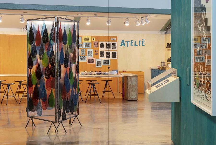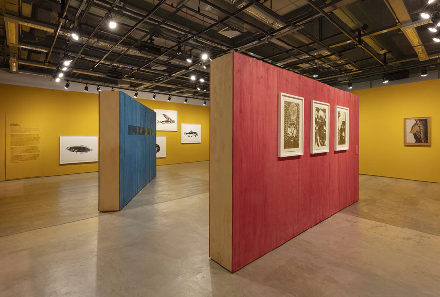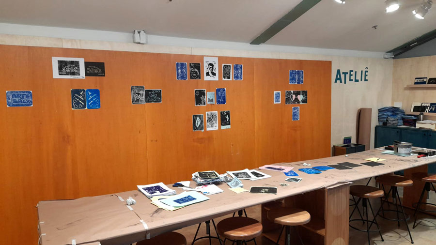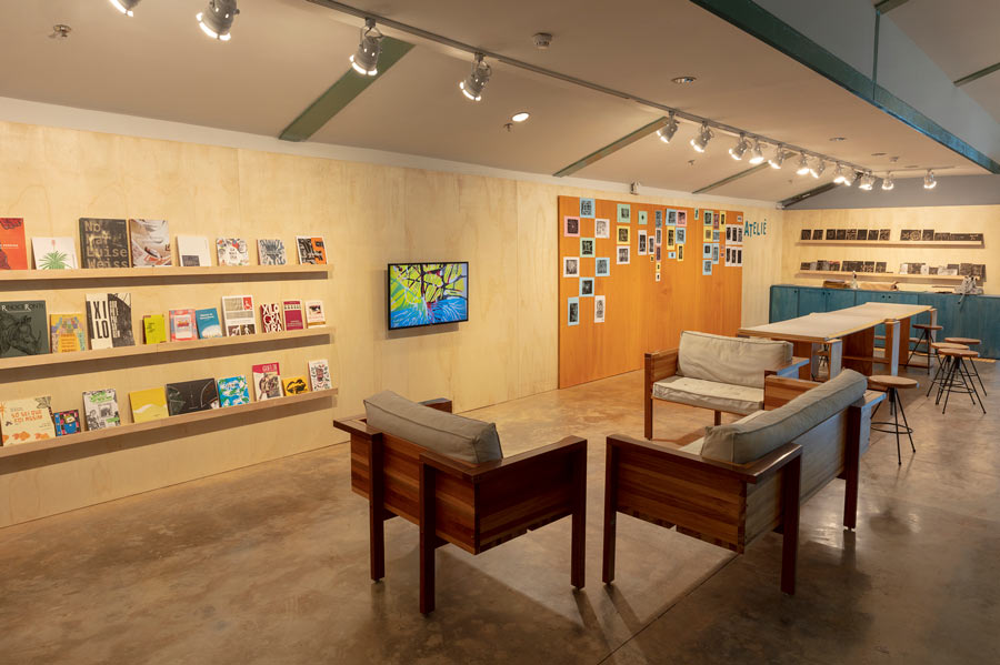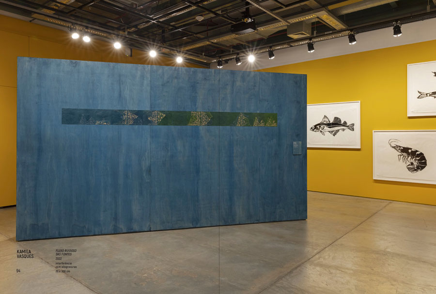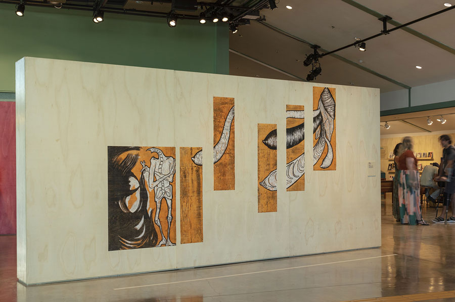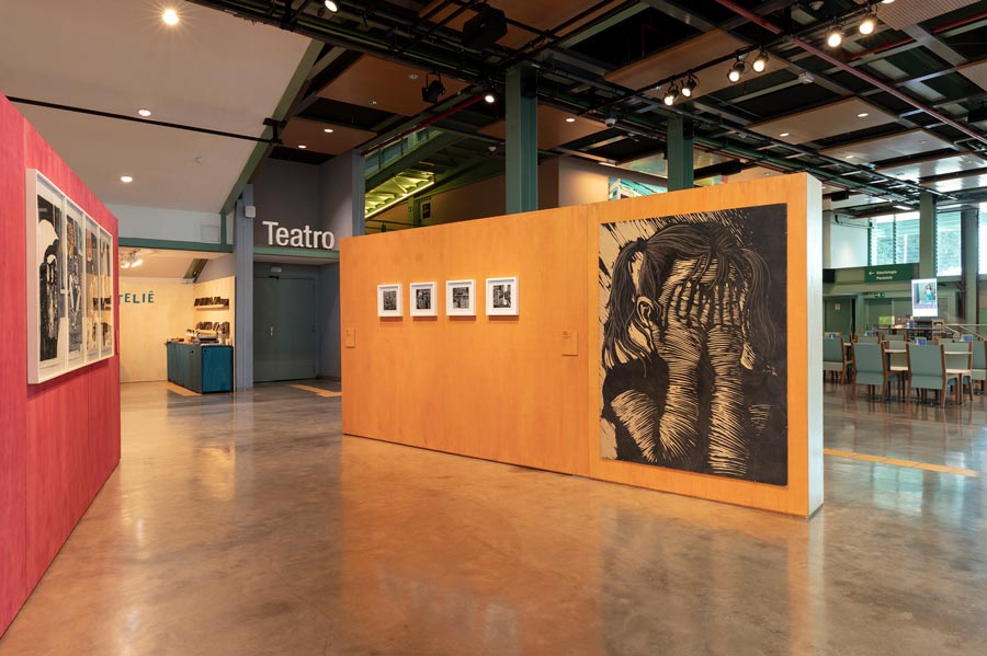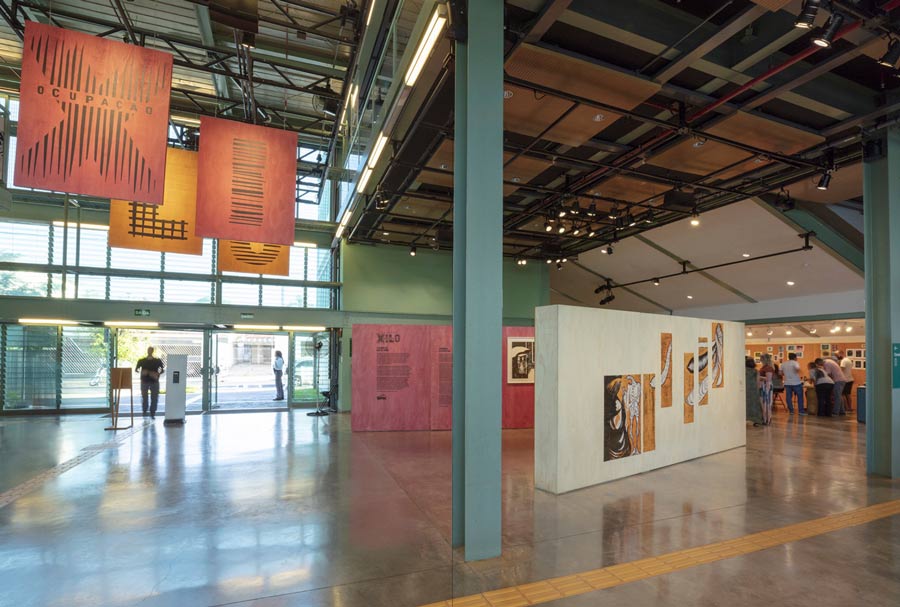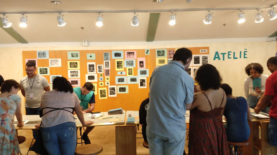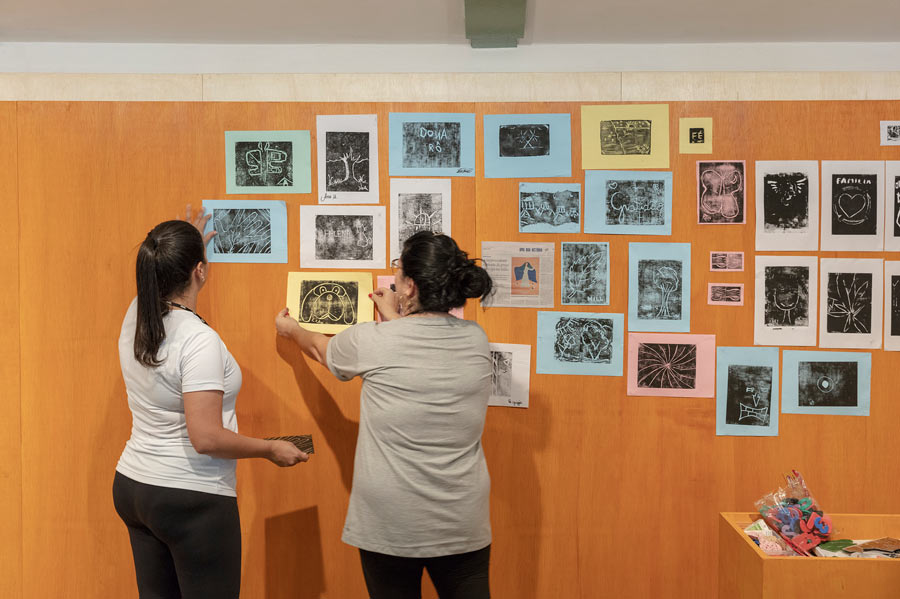 Um gesto eternamente recriado A xilogravura é uma técnica milenar cujos primeiros registros datam de aproximadamente 2 mil anos atrás e são provenientes da Índia e de outras regiões da Ásia. Na época, era empregada a técnica da aplicação de carimbos, ou “block print”, na estampagem de tecidos ou na reprodução de textos chineses, utilizando “tipos” (ou letras) de madeira para a confecção de orações budistas, cartas de baralho e papel-moeda. Como se trata de materiais perecíveis, é provável que sua origem seja ainda mais remota, já que os especialistas encontram indícios antigos de sua presença em carimbos de pedra ou madeira usados na estampagem de tecido, papel ou sobre a pele e a cerâmica na região ameríndia. Os historiadores divergem ao determinar sua antiguidade, já que a estampagem em tecido tem relação com a história da moda, enquanto a história da gravura ocidental costuma se restringir a impressões sobre papel dentro do circuito artístico, e não leva em conta as imagens impressas para outros fins. Se cruzarmos as diferentes histórias das técnicas de impressão, poderemos considerar que o formato da xilogravura é imprevisível, assim como o gesto e os corpos que atuam nessa linguagem. Ao relacionarmos os carimbos ameríndios com a experiência xilográfica, torna-se mais fácil compreender os usos contemporâneos da poesia urbana que utiliza lambe-lambe ou as interferências murais que fazem uso de diferentes técnicas de estampagem. Delimitar o início da narrativa xilográfica à publicação de livros impressos implica reconhecer seu uso apenas dentro da compreensão ocidental da história da arte e da gravura – uma história que sistematicamente assimilou o valor estético ao valor institucional e de mercado, que, por sua vez, impôs regras à produção artística, limitando edições e definindo tamanhos ou modos de exposição. Parte destacável da exposição Ocupação Xilográfica é o painel de matrizes cedidas pelos artistas, no qual o público tem acesso à forma como cada artista negocia seu desenho com a rigidez da madeira, revelando a velocidade ou a sutileza dos cortes, assim como as diferentes estratégias de uso do suporte. Perante as matrizes, torna-se visível o embate com a matéria, a destreza do corte ou a delicadeza do entalhe. A escala torna-se ainda mais presente, já que uma matriz pequena geralmente exige uma mesa de apoio e um corpo estável de mãos ágeis. Mas, conforme nos damos conta da dimensão das matrizes, fica evidente o peso e a necessidade de o corpo inteiro negociar o desenho. À medida que as matrizes crescem, é comum os artistas ocuparem o chão ou usarem a parede como apoio para o entalhe. No projeto expográfico, foi importante definir um espaço de convivência entre a mostra e o ateliê, de forma que o aprendizado aconteça entre a fruição das obras, a experimentação técnica e o reconhecimento das ferramentas e suas possibilidades de exploração, uma pequena “xiloteca” de matrizes, que podem ser compartilhadas e usadas livremente na criação de novas imagens, cruzando autorias, além de um espaço expositivo onde o público negocia seus discursos expositivos. Entender a prática artística como uma plataforma horizontal para o intercâmbio e o diálogo, desde uma perspectiva em que aprendemos fazendo e vivenciando, implica reconhecer que o público visitante não é uma entidade monolítica, mas que detém um saber valioso que é importante ser ouvido, para que os espaços culturais se mantenham vivos e não se convertam em mausoléus do saber. Assim, tão importante quanto apresentar uma diversidade de artistas e propostas estéticas a partir de uma técnica tão simples quanto a xilogravura, é fundamental encontrarmos espaços para a escuta e a transformação da própria exposição.