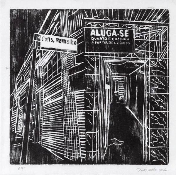 Taís Melo A artista transita pelas ruas do Bixiga, tradicional bairro de São Paulo recheado de curiosidades pitorescas, com o olhar de quem está atento às possibilidades da vida. As xilogravuras de Taís Melo abordam o tema da cidade pelo viés de quem precisa habitá-la. Aluga-se Quartos é uma série que se iniciou como ensaio performático-fotográfico no qual a artista se fazia passar por possível futura inquilina para adentrar pequenos espaços habitáveis e fotografá-los. Nesses lugares ínfimos, a preços inalcançáveis para quem vive e mora na periferia, Taís perscrutava os ambientes, procurando resquícios de habitabilidade. Diferentemente do olhar turístico que se encanta com a diversidade cultural do bairro, suas cores, bares e restaurantes, o foco da artista recai sobre os pequenos anúncios colados de forma quase aleatória, num misto de quem quer aparecer mas não querer chamar a atenção. As imagens são apertadas entre si, enfatizando a sensação de confinamento e o espaço inóspito. Em vez de um apelo, como sugerem os anúncios, as pequenas xilogravuras nos desencorajam permanecer na gentrificação que o movimento perpétuo da cultura imobiliária estabelece como prática de vida instagramável.