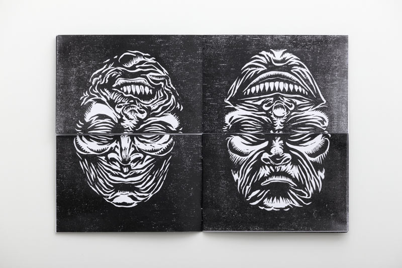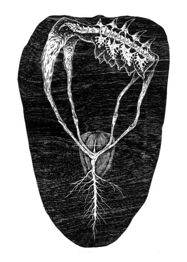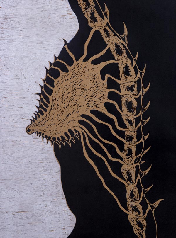 Luisa Almeida Não há como falar de xilogravura sem citar corpo, gesto, resistência material e persistência física. Quem teve a experiência de proporcionar o aprendizado da xilo a um pequeno grupo de pessoas rapidamente deparou com os limites que a técnica impõe: para fazer a goiva fluir sobre a madeira, é preciso se adaptar ao material, compreendê-lo, para então desviá-lo a seu proveito. Luisa Almeida leva essa experiência ao extremo: interessada na confecção de imagens de grandes dimensões, ela desdobra sua pesquisa estética em paralelo a uma investigação sobre procedimentos técnicos de impressão na xilogravura. Vale referir que, nessa técnica de características artesanais, realizar imagens implica carregar matrizes de madeira que, conforme seu tamanho, podem ter peso elevado e grandes proporções. Tudo isso em sintonia com a força necessária que precisa se intensificar para dar conta de entalhar a matriz. Com a consciência corporal de uma mulher de vinte e poucos anos, Luisa idealizou diversas estratégias, traquitanas e engenhocas para contornar os limites de seu corpo, desde determinar o tamanho das placas à medida que seus braços dão conta de carregar o peso até fabricar um rolo de concreto que possa imprimir a chapa de MDF no chão, sem a necessidade de ficar horas imprimindo manualmente, o que acabaria por extenuar seu próprio corpo. A tecnologia desenvolvida por Luisa para produzir essas xilogravuras, que se aproximam da escala de um para um, denuncia o que vemos nas imagens: estratégias para vencer a morte, a fragilidade e o limiar da matéria viva.