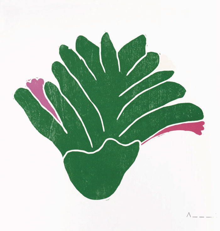 Santídio Pereira O entalhe da goiva sobre a madeira se converteu num corte radical da placa de compensado, transformando-a em módulos menores que configuram a personagem principal da imagem: as bromélias. Sem segredos, a flor vê sua escala expandir-se além de sua existência na paisagem. Seu traçado exuberante recebe modulações e recortes inusitados no desenho, a cor transforma-se e afeta o corpo da planta como uma síntese de si mesma. Santídio Pereira se refere frequentemente à paisagem e às cores da caatinga, seu ambiente natal, como fonte de inspiração e respiro para a elaboração de imagens de sobrevivência. Imagens que possam inaugurar momentos felizes entre o aperto de um dia a dia que a cidade de São Paulo faz espremer. No meio da cinzenta garoa, brotam monumentos à flora brasileira, gestos simples que reivindicam o reino das coisas belas. Se, em tempos ainda recentes, o Piauí era uma memória à qual o artista retornava para recuperar a essência vital na criação de imagens, aos poucos esse lugar se expandiu e vem conseguindo ocupar outro tempo, do porvir e do vaivém, entre as várias paisagens que os biomas brasileiros oferecem e que despontam em suas obras. A reivindicação do belo, das coisas belas, da harmonia e da graciosidade a partir de uma paisagem em risco, antes pelo êxodo e agora pela devastação agropecuária, nos permite conectar-nos com a resiliência da “floresta branca” da caatinga, cujas plantas desenvolvem tecnologias para reter água na aridez. No branco gigantesco do papel de arroz, impõe-se um desenho virtuoso que sintetiza o exuberante.