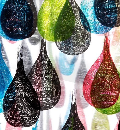 Rafael Toledo A tridimensionalidade tem sido uma tônica nas obras recentes de Rafael Toledo, que faz uso da experiência espacial para a percepção de seu trabalho. Assim, é comum sermos capturados inicialmente por algum aspecto jocoso que envolve a obra. Algumas vezes somos atraídos pelas camadas de cor sobrepostas, que criam uma imagem difusa; em outras, pelos materiais inusitados no campo da gravura. Às vezes a dinâmica de exposição parece simular um jogo no qual o visitante precisa adentrar um campo que exige sua participação, ou até um desafio inocente. Ao nos aproximarmos, porém, a jovialidade ingênua se desfaz, deixando transparecer um universo de densidades. Tanto Chuva Ácida quanto Cabeça de Ponta apresentam um uso criativo da matriz xilográfica, utilizada de forma repetida para criar um objeto de dimensões variadas e até inusitadas, desafiando a própria espacialidade da exposição. Em ambos os trabalhos, permanecem esses rostos escancarados, grotescos, entre uma humanidade cansada e a ferocidade ridicularizada. Rafael utiliza a palavra perversidade para falar de seu processo criativo, denunciando abertamente o livre trânsito da truculência humana. De um lado, o gesto de captura por parte do artista; de outro, as subjetividades manifestas do espectador.