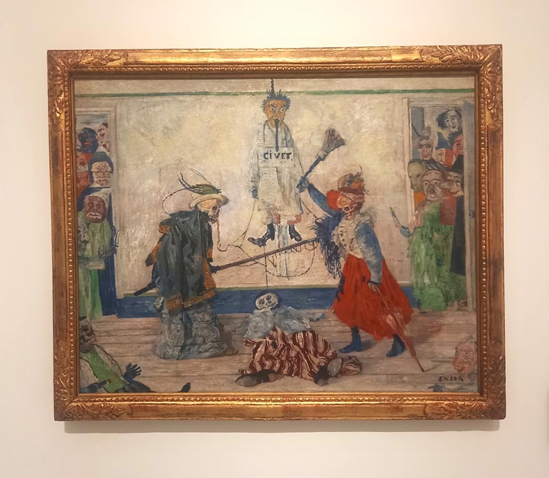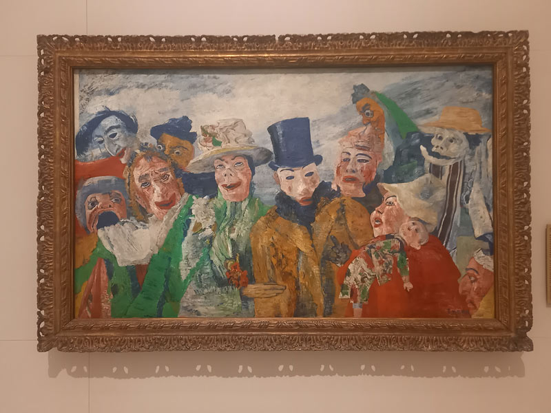 Uma “Vénus frigida”, dá continuidade ao tema que Rubens melhor pintou, o nu sensual sob um véu mitológico que permite a consubstanciação dos desejos carnais numa sociedade dominada pelo estado religioso, que à vez era permissiva e controladora da sexualidade. Este trecho mitológico diz-nos que sem alimento (Cères) e sem vinho (Bacchus), o ardor amoroso (Vénus) esmorece, e Cupido sentado sobre as setas, acanhado sob o véu que partilha com a sua musa, não mais cumpre a sua função estimuladora. O século XVII, idade de ouro dos Países Baixos, em contrapartida de um declínio comercial de Antuérpia, vê crescer os seus artistas e a criação que nasce da abundância de encomendas e da fluidez de dinheiro: Rubens, Van Dyck, Jordaens, Vermeer, Rembrandt, Ter Boch, Franz Hals, entre outros foram os seus atores. A sociedade burguesa enriquecida pelo comércio com as colónias na América, nomeadamente no Brasil, na Indonésia e em África, encomenda obras aos artistas como forma de se fazer retratar e construir uma identidade social através da imagem. São estas elites que permitem aos artistas viver, de forma segura e vender a preços acima do mercado. Emerge deste foyer artístico e intelectual uma escola que enobrece aquilo que se vai chamar mais tarde pintura de género. Disso é exemplo a obra da artista Michaelina Wautier, seguramente uma das poucas mulheres artistas a estar representada, com o tema de duas jovens raparigas como santas, num cenário aparentemente saído do quotidiano, hibridação do retrato, da natureza morta e da história hagiográfica. Podemos questionar esta lacuna porquanto havia nesta altura diversas mulheres a trabalharem este tema do retrato e da natureza morta no norte da Europa, entre estas Clara Peteers, Maria Van Osterwijck, Raquel Ruysch, Judith Leyster, Maria Sibylla Merian, que tendo sucesso na sua época, viram os seus nomes apagados até uma história recente. Ou seja, apesar das exposições que têm dado visibilidade ao trabalho “apagado” destas artistas, como é o caso da exposição individual de Clara Peeters no Museu Nacional do Prado em 2016, existe todo um processo estrutural a realizar de integração destas obras em coleções. Continuando o percurso, ultrapassamos num tempo cronológico veloz múltiplas obras que não couberam neste artigo, nomeadamente parte da coleção dedicada ao fim do século XIX (Cabanel, Tissot, esculturas de Constantin Meunier, Edgar Degas, um impressionante auto retrato de Léon Spilliaert), e detemo-nos na exposição de James Ensor, cabeça de cartaz, já que o museu detém uma quantidade significativa de obras deste autor pós impressionista, que conjuga na sua pintura vários modos de ser (e ver). Realista, simbolista, expressionista, seguindo palavras suas “ E sempre se combinam ou alternam este gosto do excecional, do anormal, e da procura da luz”, disso se dá conta quer nas pinturas impressionistas executadas com a mestria de um grande artista, “Mulher degustando ostras”(várias vezes recusada nas grandes exposições da época), e “O salão burguês”; nas telas que preanunciam a abstração como aquela que retrata o tema clássico “Adão e Eva expulsos do Paraíso”, e “A Queda dos anjos rebeldes” que toma uma outra de Frans Floris do seculo XVI como tema, e a transforma em pintura contemporânea. Nas suas obras mais particulares como “A Intriga”, de caráter profundamente expressionista, desmascara e critica a sociedade em cenário carnavalesco, num retrato satírico e pungente; a máscara, elemento favorito na obra de Ensor, surge como meio de desmascarar a natureza humana, desvelar “a alma da perversidade”. Essa máscara pode assumir a forma de caveira ou esqueleto, uma “vanitas” moderna que tem a mesma função. O carater inovador da sua pintura foi reconhecido pelos seus pares, Emil Nolde, Kirschner, Grosz comungam com ele muito do seu simbolismo expressionista.