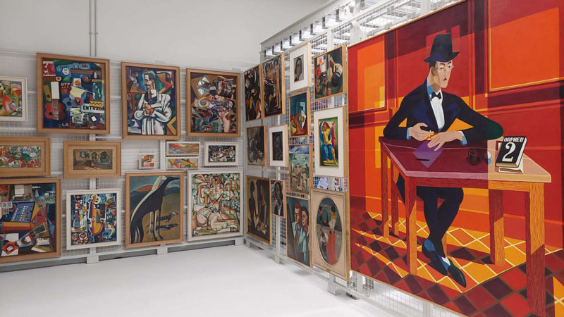 O papel do CAM como sede da mais ampla colecção de arte moderna e contemporânea portuguesa pode trazer perplexidade, senão mesmo indignação, ante a opção curatorial de dedicar a galeria subterrânea às soi-disant «Reservas Visitáveis», isto em vez de consagrar-se uma selecção fixa das cerca de doze mil obras do acervo para exposição permanente na nave principal, como anteriormente, ou no mezanino (ou agora no “Espaço Engawa”). Trata-se, antes de mais, de uma estratégia museográfica, que responde às perguntas ‘como expor?’ e ‘quando expor?’, e não tanto de uma resposta de índole museológica à questão de fundo, ‘o que expor?’. Nestas «Reservas Visitáveis», as obras em exposição irão rodando. O efeito que isto desencadeia não é desprezível, porque dá azo àquelas perguntas de sabor contrafactual a que a história da arte, com a celebração dos seus cânones, costuma reagir mal, como, a exemplo, a de saber se o que foi guardado e esquecido não merece igual atenção à do que sempre esteve exposto. Se desse modo for, que o que já andou exposto terá de recolher a reserva. Inicia-se uma espécie de contra-história, ou uma história alternativa desafiantíssima. Ao assim fazer, este CAM é um contra-CAM. Porque ao poder correr-se ali para ver o muito inesquecível quadro de Jorge Pinheiro Stabat mater (2006), já pintado neste milénio, em vez de um enésimo estudo de vanguarda novecentista; porque ao poder ver-se a muito inesperada sequência de dez xilogravuras do livro-de-artista de Hein Semke Apocalipse à Portuguesa (1975), em vez da consabida collage surrealista; porque ao poder experimentar-se a peça enigmática de Graça Pereira Coutinho Viagem ao interior desconhecido através de linhas paralelas (2015), em vez do tão regurgitado desencanto conceptual; aquilo que este CAM está de certa forma a replicar é o fenómeno de que a arte contemporânea mais se tem aproximado, o da deflagração das contraculturas (que depuseram as vanguardas). E nisto há coragem a assinalar. Tanta que as obras dos modernistas Amadeo, Eloy e Almada, num gesto que dá brado, e que fez subir o tom dos que oferecem as suas reservas a este novo CAM, podem apenas ser vistas numa exacta sala do depósito, penduradas em grades e calhas de suporte, e dispostas sem outra ordem aparente que não a de ocuparem a máxima superfície disponível, com um mínimo de respiração entre elas. Mas por sorte de uma ironia que parece bafejar as manobras arriscadas, se alguém quisesse demonstrar visual e espacialmente esse cisma em que vivem já as instituições de protecção e salvaguarda da arte moderna e da arte contemporânea de modo a distinguir as duas, não teria sucesso maior do que o acaso que se dá nesta sala dos fundos da galeria subterrânea do CAM, e a que alguém chamou já a “gaiola dos Amadeos”. É que a arte moderna ainda consegue pendurar-se e expor-se nas reservas e nos armazéns. A arte contemporânea já não. Precisa pelo menos de um Engawa.