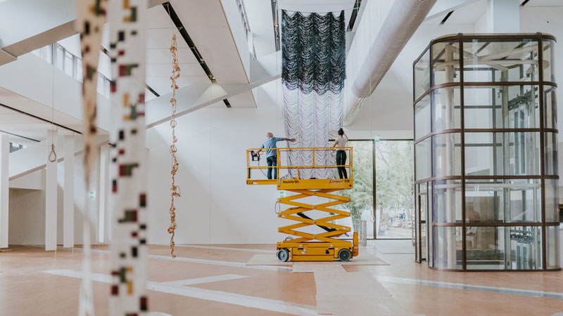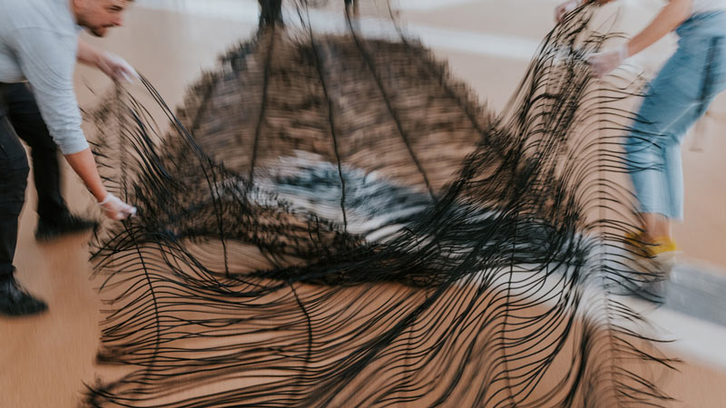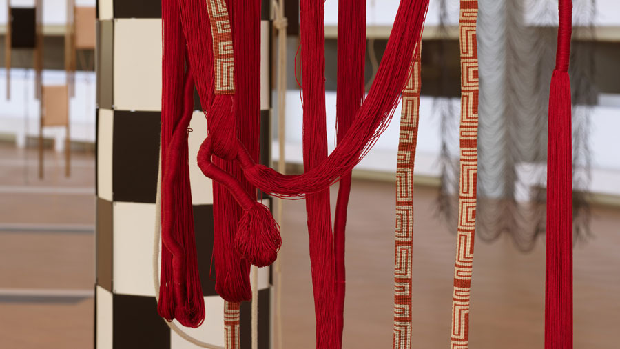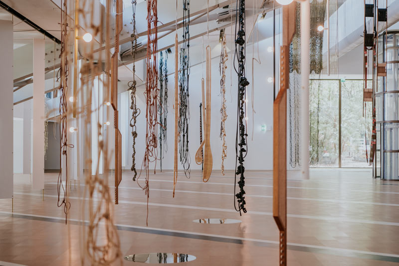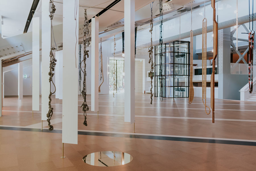 Porém, onde o sucesso da operação “novo CAM” nada garante que esteja assegurado é na exacta recuperação do edifício, com a junção grandisonante da peça arquitectónica de nome Engawa, desenhada pelo arquitecto japonês Kengo Kuma, a que já aqui apontámos a escala desorbitada, o uso incerto, a fotogenia demagógica, e a qual Edwin Heathcote, no Financial Times de dia 6 de Novembro acusou de sofrer de «a problem of inflation», não resolvendo esta ‘simples’ cobertura adossada a uma parede branca qualquer problema manifesto, tornando-se somente num pavilhão vistoso mas raté. Todavia, o que porventura terá gerado desconforto menos atenuável foi ter-se dedicado o espaço da Nave-hangar do edifício original do CAM, desenhado pelo arquitecto britânico Leslie Martin, e que apesar do aspecto datado resistiu indemne à renovação de Kuma, à exposição única, intitulada «da desigualdade constante dos dias de leonor*» da autoria de um só nome, o da artista Leonor Antunes. Desconforto injustificado. A exposição «da desigualdade constante…» tem fácil descrição física e material: trata-se de um conjunto de peças verticais (trinta e oito), em materiais correntes [madeira, couro, alumínio, corda de algodão e de cânhamo, fio de nylon, latão, baquelite], suspensas na estrutura em vigas inclinadas do hangar do CAM, distribuídas numa métrica aparentemente regular, e que apresentam a proporção de pilares delgados que nunca atingem o plano horizontal do pavimento. Se necessário for traduzir o aspecto desta exposição numa imagem naturalista, para visualização mais franca, trata-se de uma série de estalactites que transformam a nave do CAM num recinto cavernoso, uma grotta, cuja nobilíssima categoria estética que melhor a honra é o muito excelso e controverso, e ainda mais difícil de dominar, grotesco. Não o grotesco gráfico-social de um William Hogarth, mas o grotesco cenográfico de um Piranesi; não o grotesco lúdico de um Alexander Calder, mas o grotesco sofisticado de uma Marisa Merz. De todas as categorias estéticas, se descontarmos o trágico, o grotesco será seguramente a que está dada às desvalorizações mais desinformadas. Isto na igual medida em que o trágico está dado aos mais inalcançáveis merecimentos. E o mais inesperado será talvez o modo como se tocam. O toque grotesco do trabalho de Leonor Antunes supera, em subtilezas várias, a carranca do maior paladino do trágico da arte contemporânea em Portugal, Rui Chafes. E há momentos nesta «da desigualdade constante…» nos quais poderá pensar-se que o imaginário de Antunes é comum ao de Chafes. Sobretudo naqueles artefactos que transportam um lastro torturante. Mas não passará isso de uma afinidade equívoca. O trabalho de Leonor Antunes tem uma filigrana burlesca requintada e de um encantamento que o faz viajar para latitudes onde a obra de Chafes representará apenas exotismo mórbido. Antunes resuma de um enigmático jardim persa em Isfahan. Chafes é um virtuoso do punishment museum for torment design am Kölln. E estas cauções geográficas são do foro do anedotário, e cingem-se a colocar os autores em órbitas visualistas identificáveis, não são proveniências etnográficas. A exposição «da desigualdade constante…» é um recinto de conhecimento e de reconhecimento, e não um simples hall de contemplação. É a partir daqui, que o que foi atrás dito como tendo descrição fácil se muda em território de uma percepção exigente. E daí, numa descrição difícil, de onde lhe vem todo o magnetismo. A figura maior que a Antunes foi dada compor é a do labirinto, num contexto e numa atmosfera em que, por via do racionalismo árido do hangar de Leslie Martin, um típico open-space museológico pós-Beaubourg, tal pareceria uma impossibilidade, pois que se trata de labirinto que logo à entrada, mas muito enganadoramente, parece mostrar os seus meandros e revelar o seu caminho. Os fios de Ariadne estão todos à mostra. Por isto, há que dizer que quem realizou a grande reconversão do edifício do CAM não foi Kengo Kuma, mas a exposição astuta de Leonor Antunes. E será uma pena não podermos vir a observar o trabalho que a passagem do tempo viria, materialmente, a fazer a estas peças neste lugar, e cujas formas insólitas transportam para o mundo finíssimo das máquinas celibatárias de Duchamp [v. a extraordinária peça «voilette» (2024)], ou para os cadavres exquis de Picabia, mas já sem aquela ganga Dada e surrealista que faria delas um espectáculo de variedades. E a glória mais insuspeitada desta «da desigualdade constante…» é transformar a muito anódina nave ‘fero-modernista’ do CAM, numa região demarcada do mais apurado site-specific, volte-face que só aos mais audazes é dado experimentar. As peças de Leonor Antunes, que o linguajar impiedoso dos detractores já traduziu como ‘pingentes’, ‘penduricalhos’, ‘berloques’, vêm banhadas por atmosferas heteróclitas mas parecem todas verter uma crítica de fundo ao universo bonançoso da disciplina que mais marcou a ideia de progresso novecentista, o design. Neste sentido, é reconfortante observar como Antunes recua para territórios que o design fez cair em desgraça, e trabalha sobre um imaginário em que o léxico, que apesar de ter estado sempre associado à noção de bem-estar por todo o século XX, surge hoje como uma língua morta. Falamos da mobília, da carpete, do cortinado, do papel de parede, do macramé, do baquelite, do encaixe em latão, da caixilharia em alumínio, da luminária fluorescente, do almofadado em couro. As peças de nome «a toiture couronnant le tout» (2024), «Franca #5» (2018) e «Franca #3» (2018) contêm uma dimensão por um lado tão sofrida e por outro tão paródica, mas sempre num hieratismo tão abandonado, que fazem pensar se esta exposição não será afinal a recriação daquele sótão onde foram apodrecer todas a