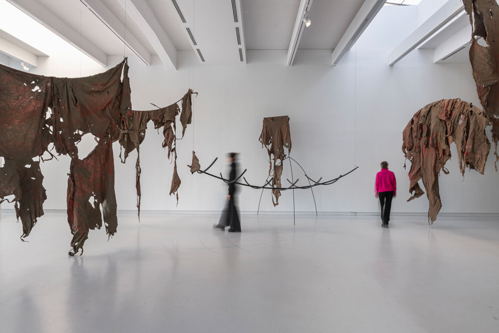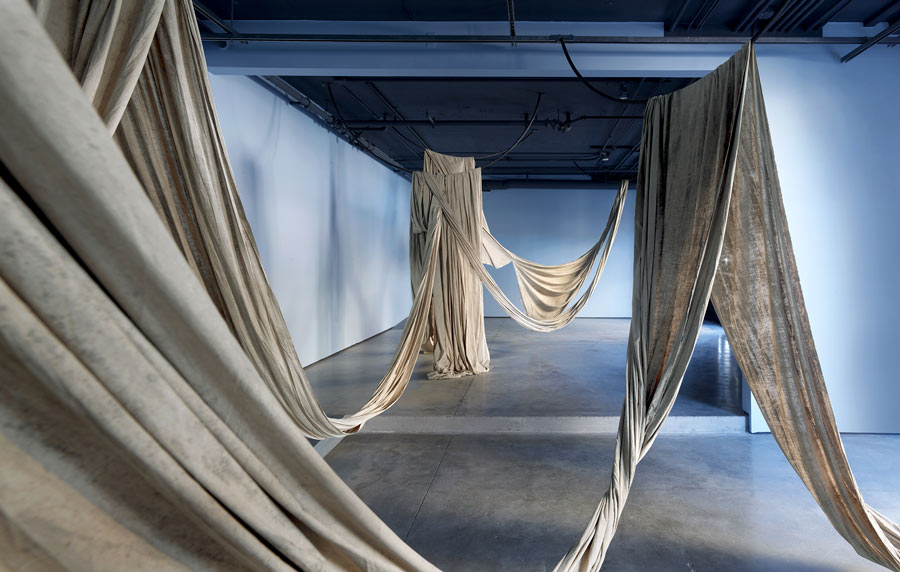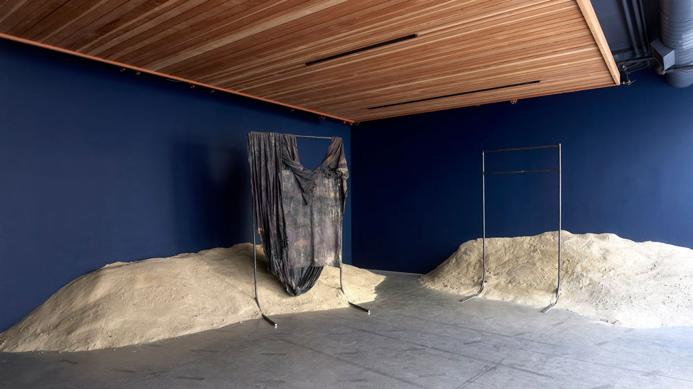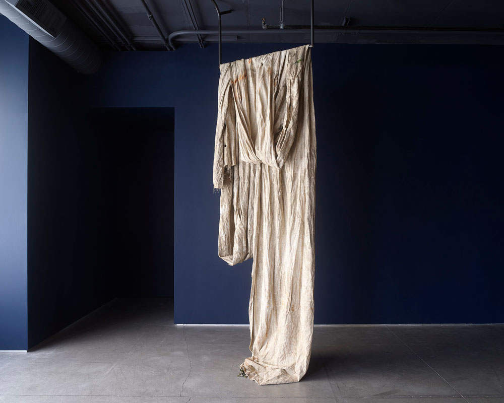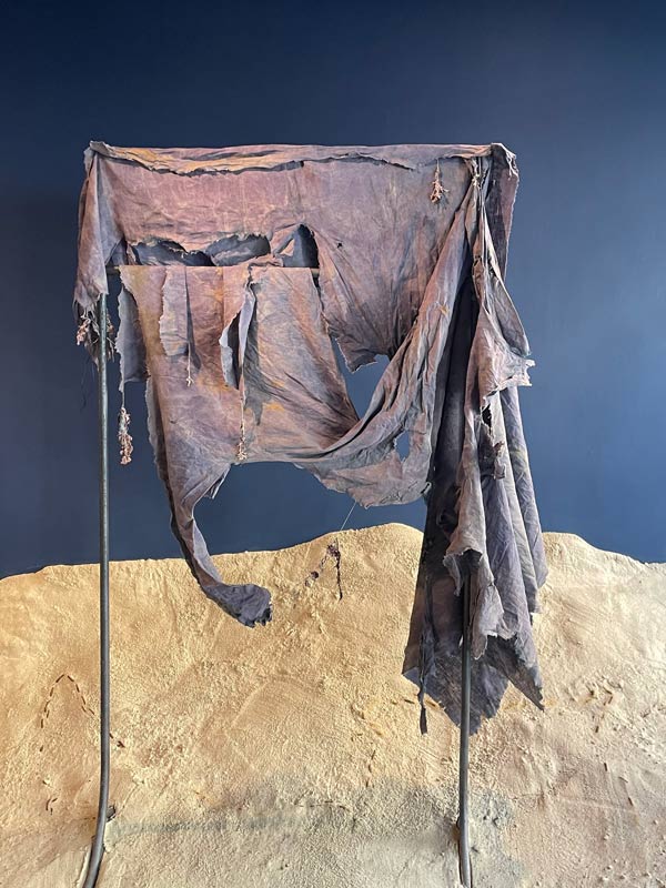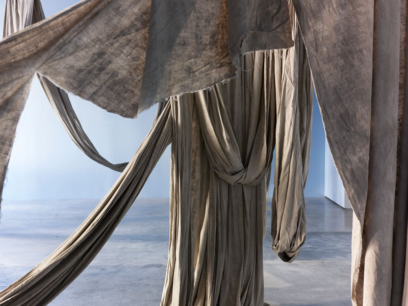 Terra, tecido de algodão, metal, grafite, tinta à óleo, barro. Eu acho que uma das maiores lições do meu trabalho ao longo dos últimos anos, tem justamente que ver com a dinâmica do controle. Eu estava no meio daquela crise que mencionei anteriormente, mas que na verdade era uma crise de quase como se as minhas fantasias de controle se estivessem craquelando, como se estivessem rachando e se partindo. De novo, o trabalho da crítica implica uma dinâmica de controle muito forte. Tentar controlar as coisas para antecipar. O pensamento dá a impressão de que se consegue ir muito mais longe do que o próprio corpo, de facto, consegue ir. Isso cria a impressão de que se tem muito mais controle das coisas do que, de facto, se tem. O meu trabalho foi me ensinando a relação com os materiais, por exemplo, se trabalho com barro, argila, no processo de produção de cerâmicas, eu posso fazer uma cerâmica de dois metros de altura. Se eu tentar fazer uma peça de cerâmica com dois metros de altura em um dia, ela vai desabar porque eu preciso ir secando a base para continuar a crescer. O material me diz: “você pode tentar seguir só o seu tempo, mas eu, o material, vou resistir a isso”. O material te devolve ao teu lugar, te ensina: “aqui você não controla, você não está sozinha nesse processo. Ou você negocia comigo ou você trabalha comigo, ou você se deixa controlar um pouco por mim, se deixa possuir por mim ou o seu trabalho não vem”. Você coloca a peça no forno, que pode explodir se você não tiver dado tempo para ela secar. Todos esses elementos, por exemplo, trabalhando com barro, são elementos que, de alguma forma, desafiam essa tendência de uma subjetividade humana de tentar controlar as coisas. Trabalho muito afundando tecidos em diferentes corpos de água. Os tecidos conseguem ter uma experiência que o meu corpo orgânico no estado de vida que se encontra, não consegue. Eu não consigo passar quatro a cinco semanas debaixo de água. Isso para mim já me coloca numa relação de reverência com esse material, porque o que eu estou pedindo a ele é uma coisa que eu mesma não consigo. Se eu coloco o tecido debaixo de água, durante quatro a cinco semanas, não tenho como controlar o que vai acontecer porque o meu corpo não acessa aquela experiência. Muitas vezes faço isso para estudar um corpo de água: faço isso no rio Tejo, em Lisboa, tenho uma resposta, faço isso na Baía de Guanabara, no Rio de Janeiro, tenho outra resposta, faço no Loire, em França, eu tenho outra resposta, porque aqueles rios, esses corpos de água têm outras histórias. As histórias deles vão interagir com o meu processo de uma maneira que eu também não posso controlar, porque não consigo dar conta de tudo isso. São aprendizados muito recentes que a minha prática vai me dando porque ainda tem uma parte de mim que tenta seguir um projeto, uma timeline. A primeira exposição que fiz em torno desses materiais afundados foi em São Francisco. Era suposto eu ir, mas não tinha o visto estadunidense - o meu visto foi negado porque não consegui comprovar que não era uma imigrante em potencial. Eu sou imigrante, é difícil provar que não sou imigrante, então não consegui ir. Tive que trabalhar meio à distância com a equipe que tinha lá ligada à instituição, para afundar e recuperar os tecidos. Um dos tecidos que afundei, quando era suposto ser recuperado, teve uma super maré que fez com que o lugar onde nós o tínhamos deixado ficasse completamente inacessível. A gente não podia chegar lá com segurança. Tive que conversar com a instituição que não tínhamos como lutar contra a maré, teríamos que esperar. A abertura da exposição estava marcada e tudo mais. Isso me pegou muito forte porque na época também não estava conseguindo entrar nos Estados Unidos e quando começámos a montar a exposição à distância, na época fazia uma residência na Holanda, trabalhava de madrugada aqui na Europa para poder me conectar com o horário de lá. Foi um projeto insano de montar e quando eu vi essas esculturas, tinham um esqueleto de metal e em cima do metal os tecidos se montavam. Desse tecido que não conseguimos recuperar, eu decidi expor só a estrutura de metal até a maré ceder e a gente conseguir acessar o tecido. Quando eu vi o metal nu, eu entrei numa crise, passei dois dias chorando. Primeiro eu pensei: “o trabalho está muito ruim, essa exposição vai ser um desastre”. Você volta para essas inseguranças bobas, mas que são muito presentes. Quando eu vi o metal nu sem o tecido porque não podia ser recuperado, eu entendi que o que eu estava sofrendo não era o medo do trabalho não ser bom, eu estava sofrendo porque a ausência daquele tecido me fez sentir a dor da minha ausência naquele contexto - que passava por não ter o meu visto aceite, por não poder me mover, por não ter conseguido provar que eu não emigraria para os Estados Unidos, que é uma coisa que eu tenho zero vontade de fazer. Esse processo para mim foi muito marcante. Não é que eu ache que a maré queria me dizer alguma coisa, mas eu acho que, de alguma forma, o facto da maré subir me permitiu chorar uma coisa que eu estava engolindo. Eu acho que isso é um momento muito bonito em que, diante de uma situação da qual você não tem controle nenhum, você sente uma fagulha de alinhamento. Você sente um momento em que aquilo que você não consegue controlar tem algo a te dizer, tem algo a te mostrar. Valorizo muito os pequenos momentos em que a minha prática me mostra algo que eu precisava saber, mas que eu não conseguiria aprender se não fosse me deixando viver. Aprender modos de abandonar as fantasias de controle, de me manter atenta às coisas. Manter atenção para que consiga perceber os momentos em que as coisas se alinham para mostrar alguma coisa. Na minha prática, que tem um componente muito forte de indefinição, eu não me vejo como mestra de nada. E