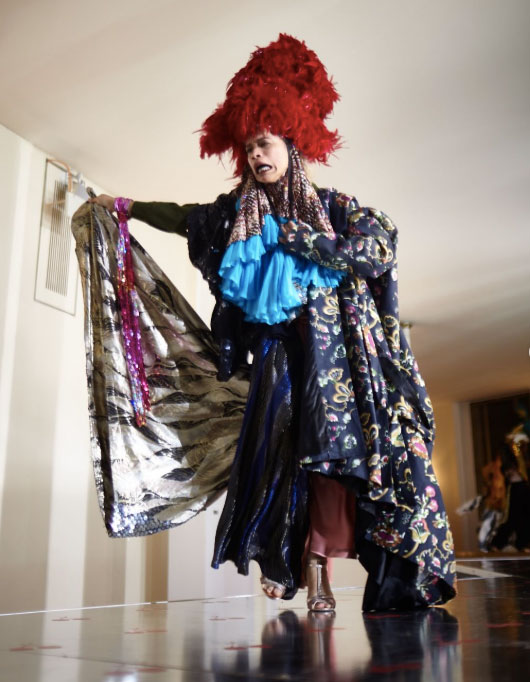 Butoh é um estilo de dança japonesa que é basicamente sobre ficares feia, mostrares-te velha, mostrares o teu corpo decadente ou então apresentares-te nessa decadência, “moribundisse”. No Japão, a velhice é uma coisa muito apreciada e respeitada. Na sociedade ocidental nórdica, do Hemisfério Norte, a velhice fica escondida, é feia, cheira mal e se morrer melhor. Na cultura japonesa não, na cultura africana também não. O Trajal trabalha com butoh mas sem ter aprendido muito, só que ele permite-se. Trabalha com butoh, voguing e runway fashion, mistura os três. Ele tem uma obsessão por fashion, então ele consegue ter uma relação com a moda – uma grande maneira de se fazer uma análise social – e faz coisas que para mim e para muita gente já são um bocado básicas – de meter homens em vestidos, vestir à tua frente roupas muito justas que não servem – esta ideia do que a moda pode fazer a um corpo, o que uma roupa pode fazer a um corpo, o que acrescenta, o que um corpo vestido com um determinado material, cor, forma, pode fazer de uma pessoa. Como te observam e como uma pessoa se sente com uma determinada roupa. How do you model this item? Que é um bocado quase pôr um outro corpo ao lado, o corpo enquanto bailarina faz uma coisa e o corpo de bailarina com esta roupa, esta identidade, fantasia, como se apresenta? Depois o voguing scene, que é extravagância, que ele também faz de uma maneira muito subtil, não é óbvia, evidente, mas tem, muitas vezes, a pessoa que fala ao microfone e está a descrever. O butoh – depois dessa verticalidade toda, beleza e fantasia – é um desconstruir de toda essa exuberância. Todos estes trabalhos ele faz enquanto pesquisa própria: já foi ao Japão muitas vezes, já esteve em Harlem nos desfiles do voguing há bué anos antes de estar na moda. O acesso que ele tem à moda tem que ver com a mãe dele que era obcecada também, eles iam a thrift shops procurar várias coisas e encontravam grandes cenas. São coisas que são da identidade dele e que ele se apropria da maneira como lhe chegaram, cria um formato de linguagem artística, então para mim é super inspirador. É um intelectual, um homem negro privilegiado que teve acessos porque não era pobre, é outra relação no mundo mas que lhe permite realmente estar dentro do sistema como ele quer.