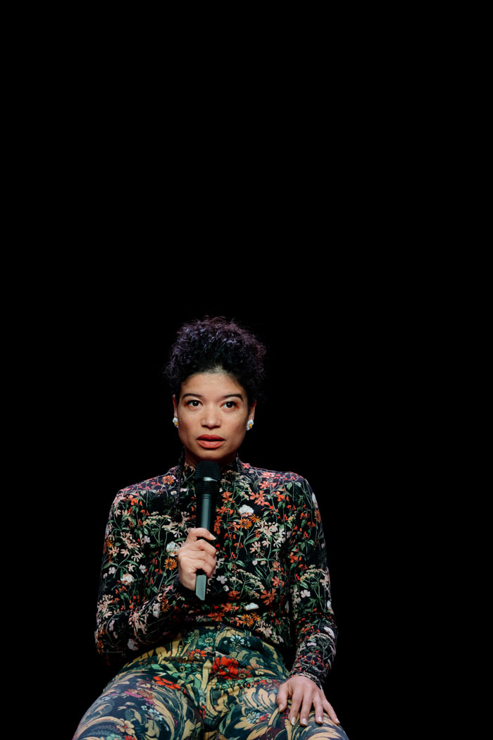 Aí eu tive a Nina Botkay, uma grande amiga minha também bailarina e que agora faz figurinos. Começou com a ideia de ter um figurino cebola – nessa ideia de camadas, um bocado na ideia da cobra que vai mudando a pele – em tons de castanho, os tons da nossa pele. Esta ideia identitária. Na altura estava a pensar no que seria ter um fato justo por baixo, eventualmente ter fatos maiores. Esta ideia já estava presente desde há algum tempo. Em residência fiz várias experiências de tirar a roupa na improvisação, muita coisa de ter calças, tirar e ter mais collants por baixo – esta ideia de parecer que vais mostrar o teu corpo, a tua pele e não mostras. Foram pesquisas que foram surgindo enquanto estava sozinha em estúdio. Depois, eu tenho várias roupas com padrões de flores. A Nina foi sempre acompanhando a minha caminhada, jornada de ideias, do que é que seria o figurino. Ela apanhou ganchos do que eu estava sempre a falar, fazer, e sugeriu que as flores poderiam ser algo no espetáculo. E pensei que as flores cheiram bem, são bonitas, são decorativas, são a natureza, também um presente que se dá às grandes divas, portanto, também fazem parte do pós espetáculo, a palavra em si é um presente da atualidade, ou seja, no que toca ao tempo. Eu gostava de toda a articulação das flores. Um drama em particular foi a Nina ter começado a ver entre as escolhas de uma peça e de outra, que todos os padrões tinham uma base preta e cores por cima, eu adorei isso. A única peça que tem um fundo branco pérola, são os sapatos. Comprámos uns sapatos parecidíssimos aos que andava a usar. Há um momento em que digo: “nada nesta peça é branco” porque a parte de dentro das roupas é branco, o que é muito comum. Quando me estou a despir, há esse momento em que digo: “eu tenho que tirar isto sem mostrar a parte de dentro que é branca porque não há nada branco nesta peça”. Outra camada das flores é nesse momento em que abro o chão e surgem mais flores e digo: “já sei o que vou fazer, vou descansar um bocadinho porque estou um bocado cansada” e tapo-me, depois vem o texto em voz off. Na verdade, esse momento também é uma morte. As mortes podem ser vistas como inícios de outras coisas, mas também, enquanto morte literal, funerais, tens a decoração das flores para prestar uma homenagem a alguém que já não está cá ou que já transicionou, o que seja. Uma criação também é uma morte, estás ali a dar tudo, estás-te a expor de uma maneira em que vão te matar com as palavras de análise daquilo que acabaste de fazer e expor, então pelo menos que faças as coisas em liberdade para poderes pensar: “digam o que disserem pelo menos fizeste aquilo que querias”. Vais sempre ser aniquilada, vai sempre existir alguém que vai ter uma crítica sobre o que escolheste fazer, vai ter uma opinião sobre aquilo que deverias ter feito. Várias pessoas disseram-me: “queria que tivesses dançado mais” e eu: “malta vocês viram a peça ou não viram a peça. A peça é exatamente sobre isso, eu estou a começar sentada a fazer um monólogo do que poderia ter sido, vocês não viram a mesma peça então”. Tudo o que eu faço tem uma consciência corporal por esse domínio que tenho sobre o meu corpo. Eu posso não estar a dançar, dançando. Tudo é dança. Esta constante magia do espaço que se vai revelando, cada palavra, cada escolha, cada decisão é a ponta de um iceberg. Nem eu própria sei o quanto que eu investi ali. Eu tenho domínio sobre uma grande parte do que eu decidi trazer para aquela peça, mas também sabendo que eu estou ali a abrir caminhos para outras análises e possibilidades que eu própria, talvez, em retrospectiva daqui a muitos anos vou poder ver o quanto eu estava a falar mais do que eu sabia que estava a falar. Não é para dizer que a peça é uma masterpiece, mas é a minha masterpiece porque até agora foi o único solo que fiz e cada vez que falo e ouço pessoas a falarem sobre, eu dou-me conta do quão a mensagem passou e o quão impacta em maneiras que me interessam.