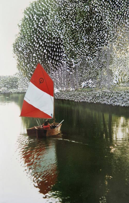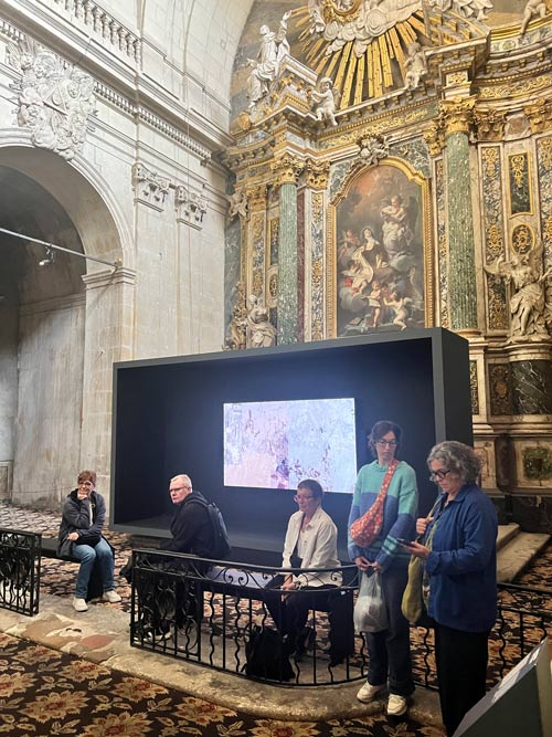 Há ainda uma grande prevalência da experimentação nesta mostra. Os encontros de fotografia de Arles são, por isso também, um laboratório de tendências. Neste ano, destaca-se a fotografia translúcida de Raphaëlle Peria, vencedora do 2025 BMW Art Makers. A técnica que utiliza cruza fotografia, serigrafia e gravura, resultando em objectos tridimensionais que comunicam com os teatros de sombras indonésios. Ouve-se a artista explicar no vídeo que acompanha a instalação: “o artista torna-se artesão”. (FIG. 8) Igualmente novo é o registo monumental, forte e sofisticado de Carine Krecké, vencedora do Prémio Luxembourg Photo Award. A série Loosing North é uma instalação que ocupa toda a Chapelle de Charité, e revela como, entre 2018 e 2025, a artista obsessivamente se dedicou a recolher imagens satélite no Google Earth da guerra na Síria. Entre outras coisas, revela a destruição de Damasco, de testemunhos individuais de protagonistas (que encontrou online), como os de Prophet e Hezbii, e como o ditador Assad, nos sucessivos ataques a civis, provavelmente os eliminou. A hiper-violência deste trabalho de seis anos de morte e de terror, apesar de apresentada de forma fragmentada, é muito bem estruturada e as narrativas são sensoriais. A artista lembra que este material está disponível online de forma gratuita, como que convidando a novos relatos. (Fig. 9)