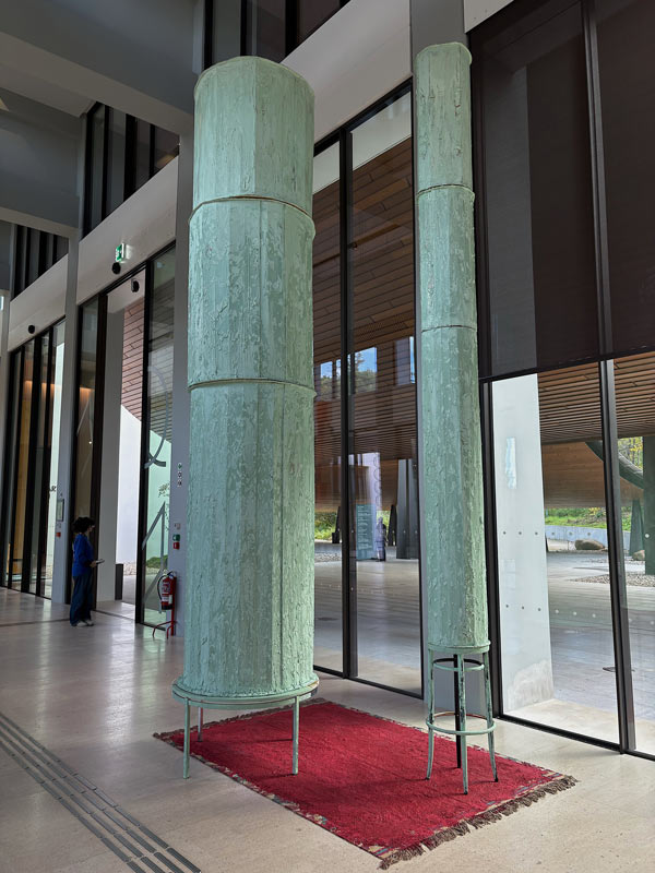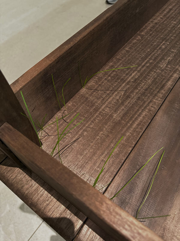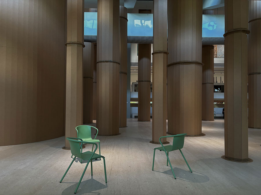 Quando o espaço se aproxima As cadeiras espalhadas pelo jardim – usadas por quem lê, conversa ou apenas frui o espaço – tornam-se parte do objetivo da exposição: estar aberto ao que nos une.?O artista reconhece estas dimensões e transforma as cadeiras verdes do jardim em elemento artístico, trazendo-as para dentro. Desta dança de cadeiras, surge o elemento vivo destas movimentações que evocam o museu como casa que acolhe, espaço de vivências e reflexões: as pessoas. Logo à entrada do edifício do CAM – a nave – o espaço de passagem obrigatória que entre muitos motivos, tais como a arquitetura que traz a luz do jardim e interliga os vários locais de passagem, convoca o espírito numa desconstrução permanente da fronteira entre interior e exterior. É também por isso que a nave é tantas vezes requisitada pelos artistas convidados. A exposição incorpora desde o balcão de informações/bilheteira ao restaurante do CAM. Com o reconhecimento do papel social de cada elemento, Bunga expõe mobiliário doméstico – mesas, candeeiros, poltronas, tábua de engomar, escadote, cadeiras, bancos, armários e tapetes. Os objetos por vezes empilhados, com sobreposições que criam caixas de Pandora que desenvolvem novos caminhos, coexistem com colunas de cartão que parecem vir do invisível – pela forma como recusam limites puramente estéticos e utilitários. Estes objetos parecem trazer a materialização dos sentidos e das memórias presentes no mobiliário, que também sobrevive no backstage da fundação.