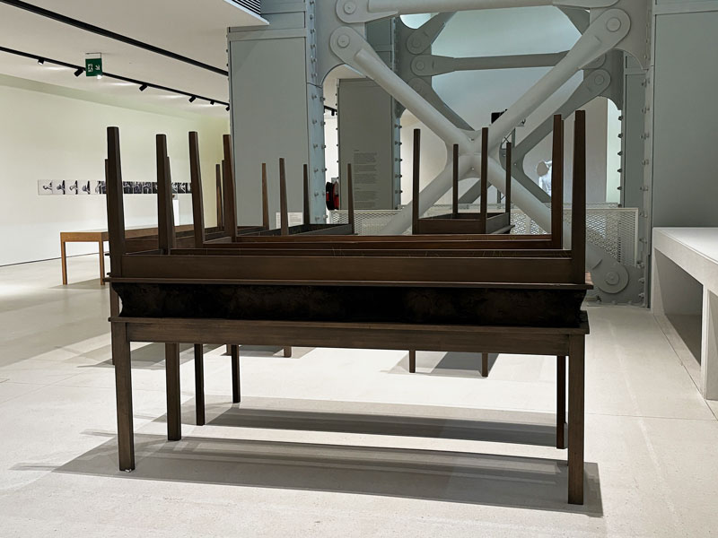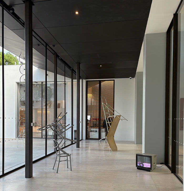 A técnica de intervenção de Bunga pintando o mobiliário – que já foi uniforme e/ou que é uniforme – cria camadas craqueladas e rachadas. Marcam a passagem do tempo e revelam vulnerabilidade. Um movimento também eternizado pelos filmes que são projetados em duas televisões sobre o histórico Ballet Gulbenkian, chamando a atenção o trabalho de Madalena Azeredo Perdigão, criadora do departamento de música e de ballet da Fundação Gulbenkian; e Benvindo Fonseca enquanto um dos bailarinos mais emblemáticos, pensando, também, no contexto em que se vive. Ao longo da exposição é possível observar os gestos de Trisha Brown, no filme Water Motor, realizado por Babette Magolte. Percebe-se que a dança está ao nível da música no processo criativo de muitos artistas. Para muitos, a música, o movimento corporal, é essencial, imprescindível e convoca a algo que vai para além da inspiração ou do estado de espírito.