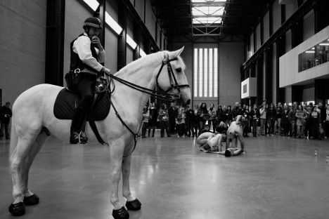 A Performance art e o museu de arte Em primeiro lugar é importante pensar nas origens e definições da performance e depois reflectir sobre a sua relação com o museu de arte. A performance art é uma forma de arte muito diversa e experimental na qual podemos destacar quatro constituintes essenciais: “tempo, espaço, o corpo do performer e relação entre performer e publico.” Estes constituintes, “são extremamente flexíveis e não aderem a regras rigorosas.” (“MAI - Marina Abramovic Institute,” n.d.) Pode ser completamente planeada ou espontânea, pode ser sobre assuntos filosóficos ou apenas sobre o nosso quotidiano, pode ter uma mensagem politica/social/histórica ou pode transmitir as convicções do artista sobre qualquer assunto. Uma performance pode abraçar inúmeras disciplinas e suportes – “literatura, poesia, teatro, musica, dança, arquitectura e pintura, assim como vídeo, filme, fotografia, slides e texto e em qualquer combinação entre elas.” (Goldberg, 1998) As possibilidades são infinitas. Em vez de produzir um objecto o artista cria um evento, um evento efémero ao vido, que pode durar horas, segundos ou até anos. O factor da temporalidade é uma das características mais desafiantes da performance. (Byrd, 2002) “A performance tornou-se aceite como um meio de expressão artística sozinha nos anos 70. Nessa altura, a arte conceptual – que insistia numa arte de ideias em vez de produto e numa arte que não poderia ser comprada nem vendida – estava no seu auge e a performance era muitas vezes uma demonstração ou execução dessas ideias.” (Goldberg, 2001, p.7) Porém, a performance já era um meio de expressão artística válido antes dos anos 70… apenas para os artistas. Dadaístas, Futuristas, pintores do Expressionismo Abstracto, artistas do Fluxus, eles já exploravam as possibilidades da performance à sua maneira. Por exemplo em Paris, Georges Mathieu encenou uma performance na qual ele atirava tinta à sua tela numa forma violenta. (Spivey n.d.) Jonh Cage com a sua peça 4’33 na qual ele “usou o período te tempo especificado no titulo para marcar ruídos do ambiente que ocorriam aleatoriamente durante a performance” transformando-os em composições musicais (Spivey n.d.) Nos anos 60 muitos artistas usavam a performance para activar consciências sobre as preocupações sociais desse tempo. Carolee Sheemann, Hannah Wilke and Valie Export era artistas feministas que confrontaram os seus públicos com os seus corpos desnudos como afirmação relativamente à objectificação da mulher. Os seus trabalhos influenciaram futuros artistas, femininos e masculinos dos anos 80 e 90 “que usaram o seu corpo e a performance art para explorar questões de género, raça e identidade sexual.” (Spivey n.d.) Até agora esta forma de arte floresceu maioritariamente fora dos limites do museu. No entanto, em anos recentes temos visto a performance dentro dos museus e galerias de arte, festivais de arte (alguns apenas dedicados à performance) e por todos os meios de comunicação. Não só conseguimos conhecer novos artistas da performance como também podemos assistir a reproduções ao vivo de performances dos anos 70 por exemplo (este assunto irá ser discutido em detalhe mais à frente). [Fig. 2 ] Sabine Breitwieser, curadora chefe de media e performance art no MoMA (até 2013), declarou que a “performance sempre esteve lá, mas nunca teve uma curadoria histórica (…) nós queremos enfatizar a performance no museu. Quando tens uma série de exposições, tu queres dizer alguma coisa. É a visão de uma instituição.” (Pograbin, 2012) Sem dúvida que esta “visão de uma instituição” a que Sabine se refere tem a ver com o ressurgimento da performance e a urgência de existir uma curadoria mais direccionada para esta forma de arte. Além disso, como a performance não “teve uma curadoria histórica” no momento certo o museu de arte contemporânea tem que desenterrar os seus arquivos e procurar a documentação que, entretanto, se espalhou pelos seus departamentos ao longo dos anos: “O Museu de Arte Moderna (MoMA) e o Whitney em Nova Iorque, Tate Modern em Londres, Centre Pompidou em Paris e o Mori em Tokyo, só para enumerar alguns, cada um tem uma colecção extensiva de material produzido durante performances incluindo desenhos Dada e Futuristas, cenários do Construtivismo Russo, acessórios de parede dos Gutai e todos os tipos de instruções, guiões e documentos espalhados pelos seus departamentos catalogados como “desenho”, “fotografia”, “vídeo, “pintura” ou “escultura”. (Goldberg, 2012) Mas agora estas obras de arte estão a ser finalmente reconhecidas por aquilo que são. Os museus de arte estão-se a adaptar às últimas formas de arte e já criaram departamentos para a performance e para a arte time-based, contrataram curados qualificados e construíram novos espaços para receber estas expressões. (Goldberg, 2012) Algumas instituições como a Tate com seus recentíssimos Tate Tanks (irão ser discutidos mais à frente), a bienal do Whitney que dedicou um andar inteiro à performance, o departamento de performance art do MoMA que está a ser um sucesso e muitos mais são só alguns exemplos de instituições que se têm vindo a envolver com a performance de múltiplas maneiras. (Goldberg, 2012) Porém, a história da performance e do conceito do performativo têm vindo a desafiar as narrativas da história da arte e a construção de significados dentro do museu de arte. “Desde o início que os museus, galerias, o mundo da arte e o mercado da arte no geral têm sido principalmente orientados para o objecto tendo configurado as suas estruturas internas e infra-estruturas para acomodar a apresentação e preservação da obra de arte estática.” (Paul,2006) Sem dúvida que as características intangíveis e efémeras da performace art vão restringir o envolvimento com a instituiç