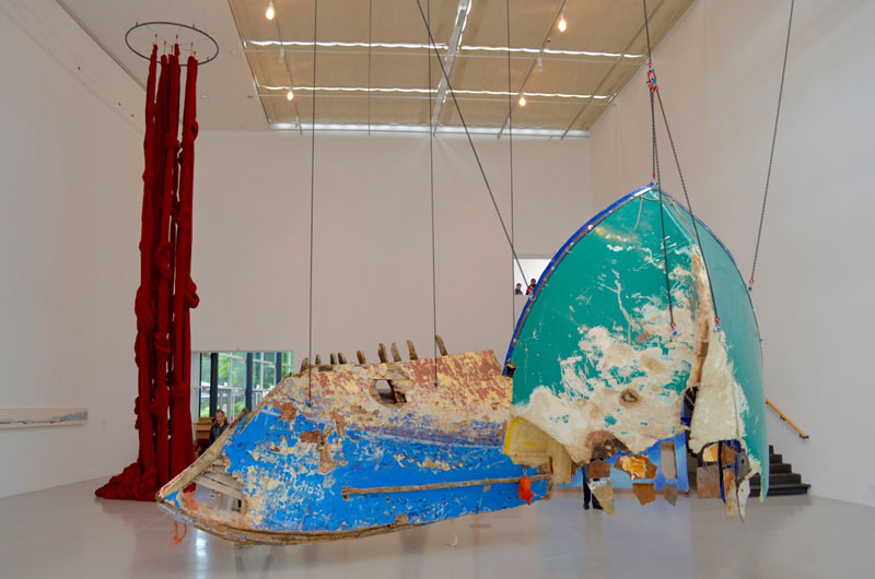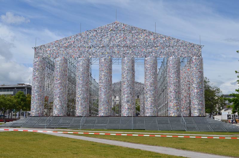 O ex-libris da Documenta 14 é o "Partenon dos livros" de Marta Minujín. A maior obra pública na já longa história da Documenta, montada em plena Friedrichplatz (praça central de Kassel que foi palco de uma queima de 350 000 livros durante a época nazi). Uma réplica em tamanho natural do Partenon. Trata-se, segundo a artista de "uma homenagem à democracia como invenção grega e à liberdade de expressão". Todos os livros aqui expostos foram proibidos por motivos políticos ao longo da história. Em 1983, a artista já tinha erguido um „Partenon de los libros" em Buenos Aires (em escala 1:4) com os volumes proibidos durante a ditadura argentina. Colocada mesmo em frente do Museu Fridericianum, a instalação funciona bem em termos arquitetónicos e simbólicos apesar da artista não ter conseguido angariar os 100 000 livros inicialmente previstos. Parte da estrutura metálica está por isso desprovida de livros, deixando uma imagem de "work in progress" e de "obra de fachada" para os críticos. As opiniões dividem-se de facto: para uns, a instalação constitui um dos pontos altos da mostra (uma homenagem ao livro e à informação impressa em plena era digital) e para outros, trata-se de um... flop (uma obra inacabada apesar do chorudo orçamento e dos 5 anos de preparação). Diga-se em abono deste último argumento que a organização do preview deixou, também ela, bastante a desejar com a ausência de inúmeras fichas técnicas para identificar os artistas e a falta de preparação dos vigilantes a dificultar grandemente o trabalho dos jornalistas e profissionais. Ainda na Friedrichplatz: a contínua exalação de fumo branco do alto da torre do Fridericianum interroga os transeuntes e vem relembrar as queimas de livros e os campos de concentração nazis bem como a própria destruição do edifício pelas chamas em 1941. Título da obra: "Expiration Movement Manifest" de Daniel Knorr. No Fridericianum, os grandes temas aqui são "emigração", "fronteira" e "democracia". Vlassis Caniaris (n.1928, Atenas; f. 2011) apresenta "Hopscotch" de 1974, uma instalação de seis figuras humanas e nove malas sobre um tapete em que as várias etapas do percurso dos emigrantes estão registadas a giz. Palavras como "Serviço de estrangeiros", "consulado" e... "desorientação". Outra obra que não perdeu nada da sua mordacidade: "Acropolis Redux (The Diretor´s cut) " 2004, do artista sul africano Kendell Geers (n. 1968), uma instalação de rolos arame farpado dispostos sobre estantes de metal. Com uma grande simplicidade de meios, o vídeo "27th February“, 3 min) de Thanassis Totsikas (nasc. 1951 em Larissa, Grécia) mostra um idoso a ser transportado nas costas de um jovem numa fronteira montanhosa. Uma interrogação sobre o fechamento das fronteiras e a solidariedade intergeracional. Com The Landscapes of Greece" (2014), uma lúdica vídeoperformance de 7,10 min., filmada no seu atelier, Yorgos Sapountzis (n. 1976, Atenas) traz uma agradável lufada de ar fresco para o Fridericianum. Stefanos Tsivopoulos (n. 1973), artista grego, radicado em Nova Iorque, apresenta um arquivo performativo. Uma coleção de 900 imagens, recolhidas ao longo de 10 anos, retrata os momentos políticos mais relevantes da Grécia do pós-guerra, da época da ditadura grega e da guerrilha marxista "17 de novembro". Se o arquivo e as projeções fotográficas já são visualmente apelativos, a instalação transforma-se e ganha uma dimensão original com a intervenção de performers que trocam as imagens, entoam ares de ópera e dialogam com os visitantes numa multiplicação de combinações e situações. Recentemente erguido na movimentada Koenigplatz, o "Monumento aos estrangeiros e refugiados" - um obelisco de 16,20 m. de altura com a famosa citação bíblica "Era estrangeiro, e acolhestes-me" do Evangelho segundo São Mateus - é desde já o local preferido para as selfies dos jovens imigrantes de origem turca e árabe que gostam de ler a mensagem traduzida nas suas línguas. Lembrando a universalidade dos valores humanistas e da hospitalidade, Olu Oguibe (n. em 1964), artista norte-americano de origem nigeriana que sobreviveu à guerra do Biafra (um conflito que levou à morte de cerca de 2 milhões de pessoas de 1967 a 1970) faz aqui um grandioso apelo à cultura de abertura e de acolhimento. Omnipresente em Kassel: a dupla franco-alemã PRINZ GHOLAM (Wolfgang Prinz n. 1969, Leutkirch, Alemanha / Michel Gholam, n. 1963, Beirute) combina imagens de arquivo, video-performances e desenho, recriando e recontextualizando as poses escultóricas ora expressivas, ora marciais da tradição clássica e neo-clássica. Outra dupla binacional: Marie Cool (n. 1961, Valenciennes, França) e Fabio Balducci (n.1964, Ostra, Itália). Banais secretárias empilhadas e colocadas na vertical criam uma instalação espacial onde Marie Cool executa performances silenciosas. A autonomia e a delicadeza dos seus gestos reforçam a tensão espacial e outorgam poesia e beleza ao impessoal mobiliário industrial, associado às normas e à monotonia do mundo dos negócios. A grande sala da Documenta-Halle é dominada pelas duas esculturas: um "quipoem", instalação imersiva constituída por gigantescos fios de lã que sincretizam referências mitológicas gregas e andinas da autoria de Cecília Vicuña, poetisa e artista visual chilena exilada em Nova Iorque desde os anos 80 e "Fluchtzieleuropahavarieschallkörper" (em tradução caseira: Corpoderessonânciaavariaeuropadestinopararefugiados) de Guillermo Galindo (n. 1960, na cidade do México): um conjunto de destroços de barcos de refugiados, de remos e de boias de salvação transformados em instrumentos musicais com peles de cabras, cordas de piano e de címbalo, ferro-velho e metal. Galindo não visa uma execução musical no sentido estreito da palavra mas sim a expressão sonora da materialidade e da carga simbólica dos objetos encontrados. Hiwa K (n. 1975, Curdi