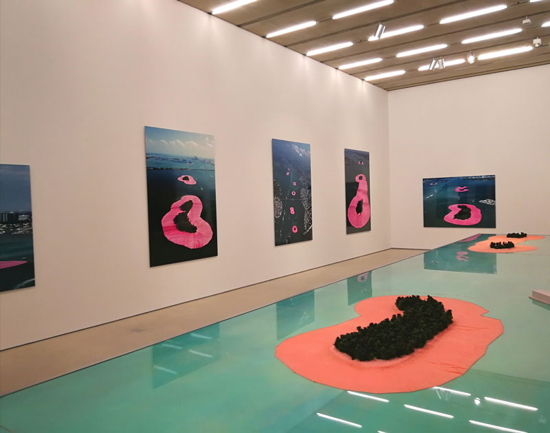 Independentemente dos projetos conceptuais e programáticos destas feiras que acabo de referir, todas elas podem ser consideradas uma aposta segura. A par delas temos ainda projetos como é o caso da PINTA - Crossing Cultures que estabeleceu uma parceria com a MANA Wynwood, ou a NADA - New Art Dealers que tem mudado pontualmente de local ao longo dos anos. Ambos os projetos são igualmente sólidos e no caso da PINTA de elevadíssima qualidade. MANA Wynwood encontra-se precisamente num bairro (Wynwood) que nos últimos dois anos tem sofrido uma evolução absolutamente excecional. Um bairro que até muito recentemente se caracterizava pela criatividade artística associada exclusivamente à Street Art, hoje é seguramente o bairro mais trendy (na moda) de Miami, onde o investimento é estimulado através de um programa governamental local Wynwood Business Improvement District. Durante a Miami Art Week, Wynwood assemelhava-se a um recinto de um Festival de Verão num ambiente urbano com delimitações impostas por artérias de circulação que são muitas vezes parcialmente interditas ao trânsito por largos períodos diários. MANA Wynwood apresenta precisamente um dos maiores espaços multifacetados para realização de eventos culturais disponíveis em Miami. Wynwood, só por si, apresenta-se hoje como uma “marca” exclusiva, com website próprio, hashtags, contas no Instagram, Twitter, e outras redes socias. À semelhança de Wynwood, há várias zonas hoje em Miami, que estranhamente ou estrategicamente, se ostentam publicamente como uma espécie de entidade interativa, que apesar de fazer parte de um Governo mais abrangente, publicitam-se como entidades autónomas de decisão, com regras e leis especificas de desenvolvimento numa estratégia de progresso estudado. O Design District que é particularmente icónico em Miami e caracterizado pelo comércio de luxo; desde moda, design, a arte, instituiu acerca de quinze anos esta lógica de zoneamento estratégico ao criar uma associação de empresários que hoje domina e gere esta área. É no Design District que se encontra o ICA Institut of Contemporary Art of Miami, De La Cruz Collection, ou o The Moore Building, que ao estarem inseridos neste projeto zonal com marca independente são associados a uma oferta muito específica, exclusiva, que compete em diversas categorias com outras zonas de Miami. Aparte das estruturas provisórias ou dos projetos inseridos nestes zoneamentos em “construção” (under construction) e permanente evolução, os Museus estão de certa forma a oferecer tudo aquilo que os eventos com um caráter eminentemente comercial e temporário não conseguem, mesmo por esse não ser o seu principal objetivo. Como exemplo disto é o caso do Pérez Art Museum Miami com pelo menos duas extraordinárias exposições, Christo and Jeanne-Claude: Surrounded Islands, Biscayne Bay, Greater Miami, Florida, 1980–83 | Uma exposição Documental, e ainda Ebony G. Patterson “. . . while the dew is still on the roses . . .”. O ICA Institute of Contemporary Art Miami, apresenta uma retrospetiva da Judy Chicago “A Reckoning” e ainda Larry Bell “Time Machines”. No MOCA Museum of Contemporary Art North Miami (que fica consideravelmente fora do circuito de tudo o resto) com uma extraordinária exposição sobre o coletivo AFRICOBRA com o título “Messages To The People”. Por fim, o The Bass em Miami Beach apresenta algumas exposições com um caráter e abordagem talvez mais “popular”, como é o caso dos The Haas Brothers: Ferngully, ainda Paola Pivi; Art With A View ou Odalis Valdivieso; Walgreens Windows.