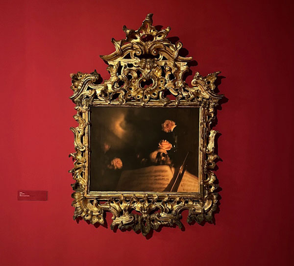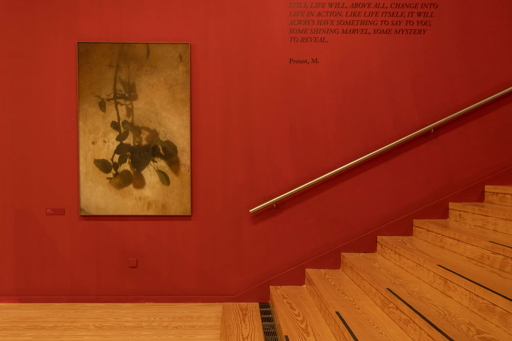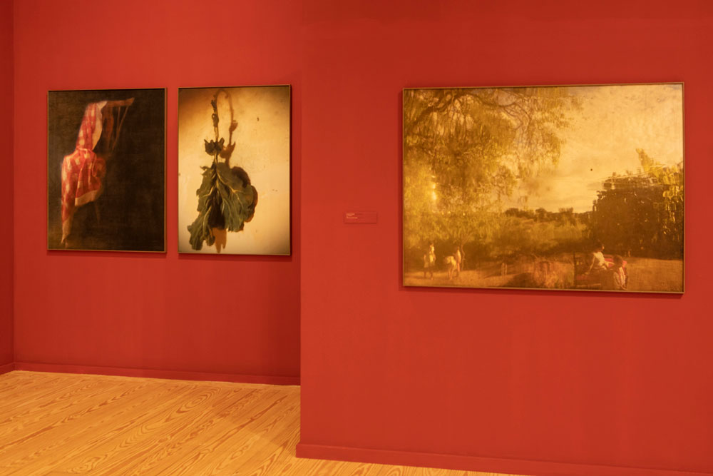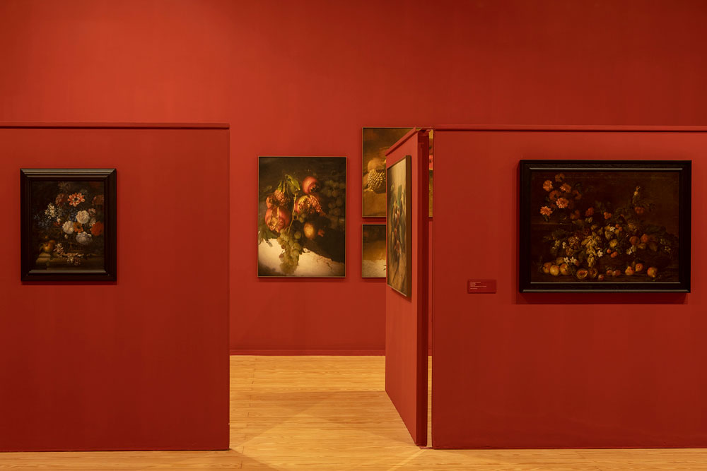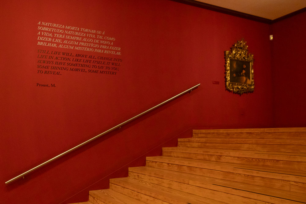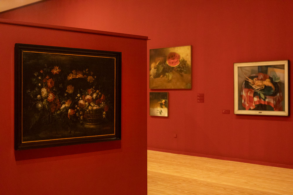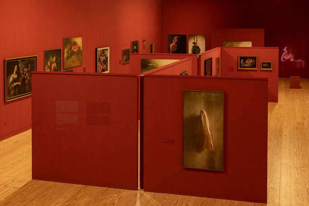 Como em tantas outras exposições de naturezas mortas (Les Choses au Louvre em 2022 foi uma notável excepção, pois procurava revelar a alma secreta dos objetos inanimados), contentamo-nos em meditar um pouco sobre a futilidade das coisas, de divertir-nos um pouco (diante da horrenda lagosta de Eduardo Viana) e, basicamente, de simplesmente admirar sem mais a técnica repetida mil vezes, como o virtuosismo do jogo de luz sobre as uvas na pintura anónima do século XVII/XVIII, Fruteiro (numa paisagem), ou a suavidade táctil das pétalas das violetas silvestres ("amores perfeitos" em português) de Alice Grillo de Lima (primeiro quartel do século XX). Contentar-nos-íamos com isso à falta de algo melhor não fosse o facto de, misturadas com estas 28 telas nas paredes vermelhas, estarem 28 fotografias de Rita Magalhães. Fotografias, realmente? À entrada da sala, com vista para a exposição, uma extravagante moldura dourada apresenta uma Vanitas discreta. O objetivo é evidente, levar o visitante a interrogar-se: pintura ou fotografia? Então, claro, o pequeno jogo poderia ser de distinguir sem ler as legendas o que é pintura e o que é fotografia, e, às vezes, podemos enganar-nos. Uma das distinções evidentes aqui, é antes de mais que as naturezas mortas pintadas são, na sua maioria, nítidas, completas, estáticas, bem acabadas, bem “polidas”, elas afirmam-se claramente face ao mundo, elas assumem o seu papel de representação. Enquanto as fotografias são desfocadas, indecisas, caprichosas, movimentadas, as formas são abertas, fragmentadas, os contornos são imprecisos.