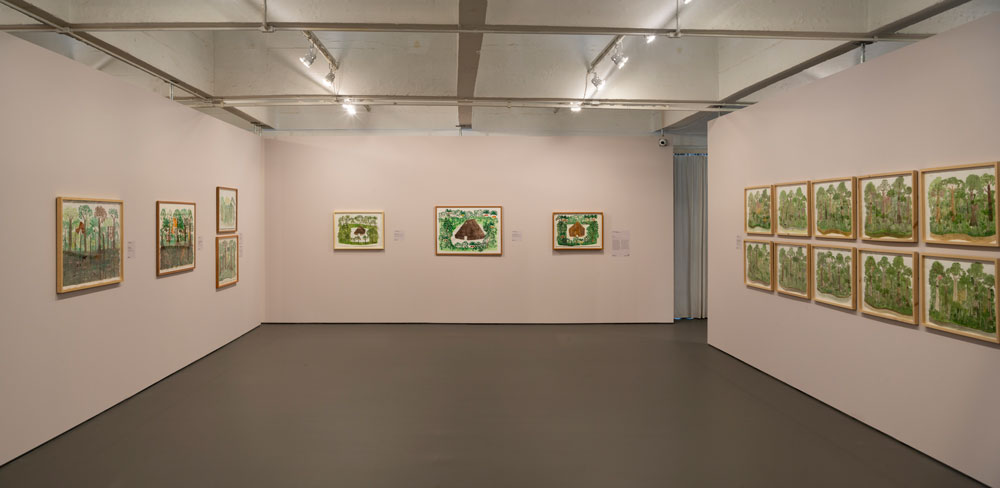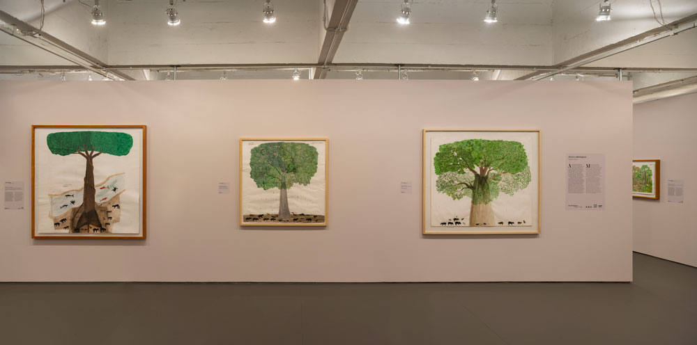 Naturalmente que tanto Adriano como Leandro, os curadores, carregam conhecimento sobre a exposição que propõem, terão estudado os seus temas origens e enquadramento cultural, e tudo o que eu não sei, não estudei, e desconheço. Escuso-me assim a continuar o sublinhado de que qualquer nota sugestiva da minha parte quanto ao espaço entre a plataforma e o comboio, ao espaço entre o texto, visão institucional e a obra, será por demais ignorante e não mais que fruto do aliciamento que estas obras me trouxeram. Fruto da felicidade de encontrar o brilho no olho da obra do artista de quem nunca vi a face; de encontrar o engajamento com a feitura. Como nota adicional acrescento que já na Bienal de Veneza de 2024 com curadoria de Adriano Pedrosa, obras de Abel haviam sido apresentadas, séries centradas na apresentação taxonómica de parte da flora amazónica, com valor científico ao nível da recolha – cor, texturas, formatos, etc. – sem perda da candura do registo, dando uso à sabedoria botânica para a qual foi educado desde infância. Note-se que, se Abel foi treinado desde a infância a reter este conhecimento, foi apenas nos anos 90, mudando-se para Bogotá para fugir aos conflitos armados, que “em contato com a fundação holandesa Tropenbos, foi incentivado a desenhar para registrar e compartilhar seus conhecimentos sobre a floresta. “ Retornando à traseira, onde demos de caras com a unidade, sim. Mas onde encaramos por acumulação a incerteza dessa vida e dessa árvore. Árvore que também morre e vida que nem se sabe o que será. Aqui, a sugestão acontece via incerteza. Dela nasce a união imaginada do humano com a árvore. Só dessa imaginação aparece o uno da vida, da morte, e da imagem que estes podem ter, tudo considerado.