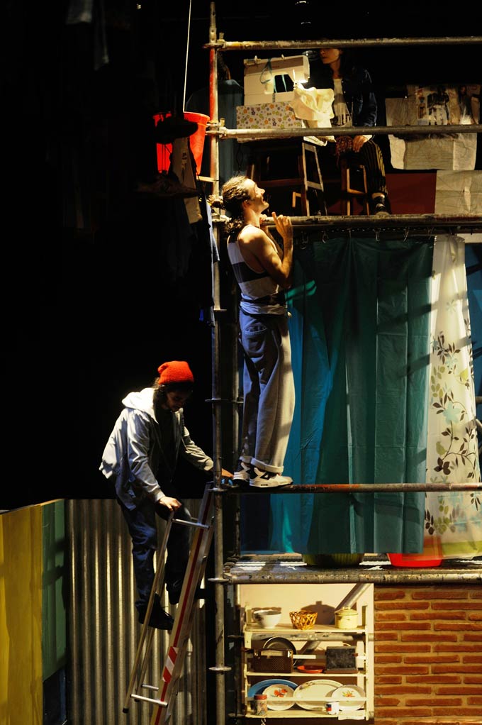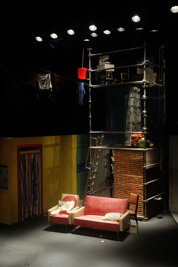 A primeira coisa que eu pedi à Rita [Lopes Alves], – que eu gostava, mas não ficou – foi que a casa fosse em altura, para ser muito pequena e o hospital muito grande. Ela gostou da ideia da casa em altura e começámos a desenvolvê-la, embora ela estivesse um bocadinho receosa, porque a Rita não é uma pessoa que costuma trabalhar ferro. Ela queria fazer em altura com madeira, mas opus-me, porque, primeiro é mais prático o ferro, se assumirmos realmente o andaime. Depois, é muito mais barato. Além disso, há uma textura de pobreza no ferro, que é muito diferente da madeira. Ia parecer uma casa IKEA norueguesa. Sendo que ela gostava mais do ferro, mas tinha medo de trabalhar com um material que não conhecia tão bem. Havia, também, a ideia – não sei porquê – das cordas de roupa. O que me lembro, quando andava na Cova da Moura, era de ver estendais de roupa pendurados de uma casa à outra. Sempre associei famílias mais numerosas e pobres às cordas de roupa. A Rita gostou muito da ideia, mas não sabia ainda bem como é que as havia de usar. Como também havia outra questão, que era como é que criamos dois espaços que são completamente distintos num palco tão pequenino. Ainda pensámos em fazer a casa na sala principal [Sala Musset] e o hospital na outra sala, mas isso traria um problema: como é que faríamos a cena do fim com o Marito? Teríamos de obrigar o público a ir de volta para a primeira sala para ver dois minutos de espectáculo. Então, começámos a pensar na divisão do espaço e achámos que poderíamos aproveitar esta questão das cordas para criar uma camada que não fosse só um pano preto. Uma camada mais orgânica e que pertencesse à própria vida da casa e que entrasse na cena em si. A Rita é muito boa a compor estas coisas pequeninas, que dão alguns sinais, mas que também não são realistas. A casa de banho, na verdade, tem um chuveiro feito com umas cortinas. A cozinha tem mais coisas, mas porque ela começou a perceber que os actores mandavam tudo para todo o lado.