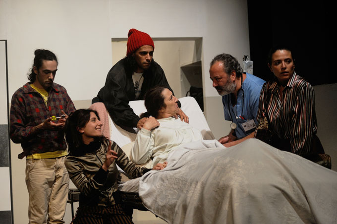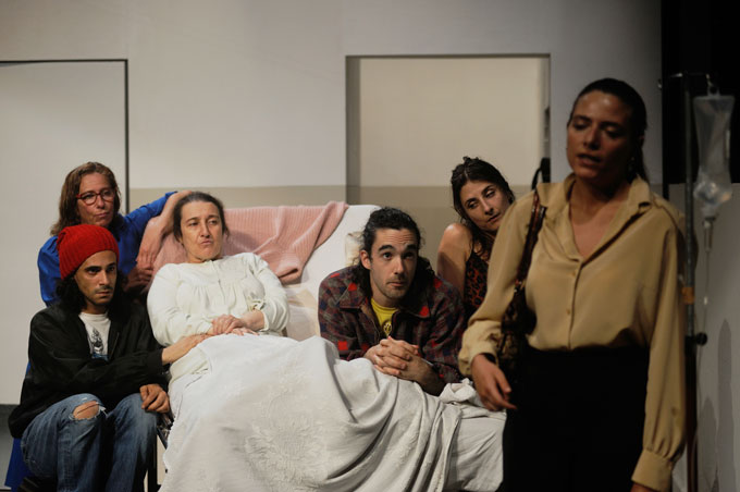 Este espetáculo, apesar de ser um espetáculo duro, tem momentos de humor em que ficamos um pouco desarmados, porque não conseguimos não rir, como no momento em que cantam os parabéns à avó no meio de uma emergência de saúde. Como é que se encontra esse equilíbrio a construir o espectáculo? O texto sugere-o, de facto, pela via do absurdo, mas julgo que tenha de haver um trabalho em cima dessa sugestão.