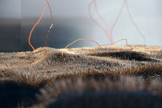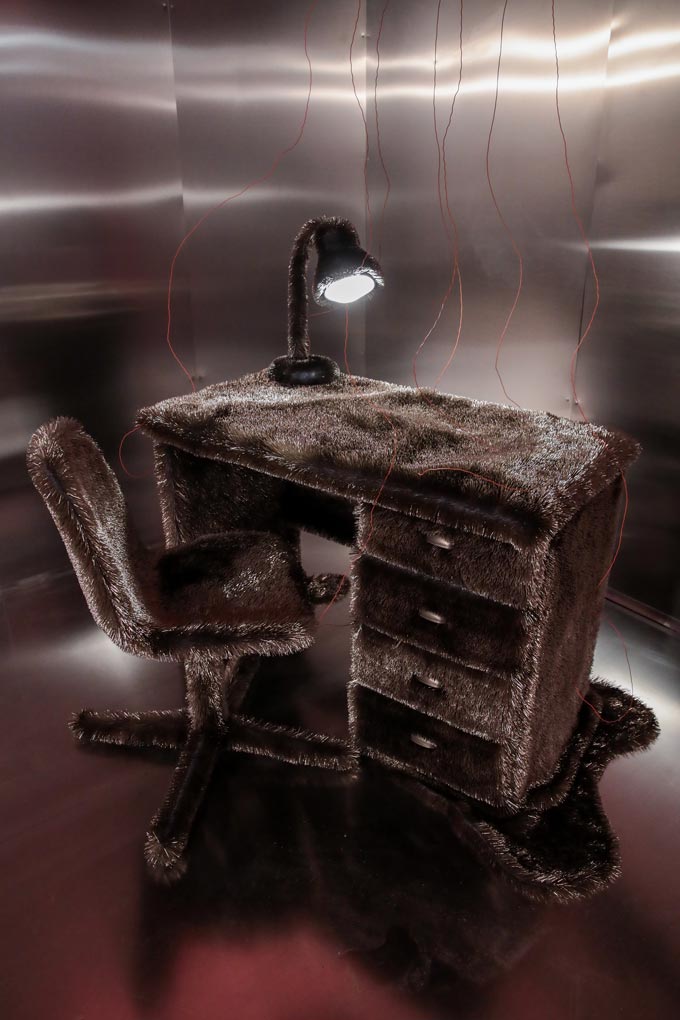 O seu núcleo incide na dimensão táctil. Como se através de um gesto que vê, explora texturas de forma saturada, articulando uma realidade de excessos visuais, que pretende reanimar a nossa sensibilidade táctil. Todos os elementos são inteiramente engolidos pela organicidade de texturas distintas num diálogo de afetação entre matéria e corpo, desenvolvido no especto de contrastes entre o que cativa e o que repele.