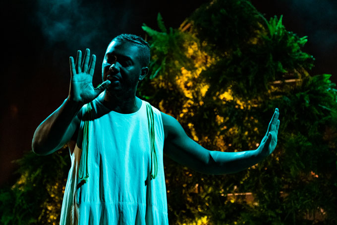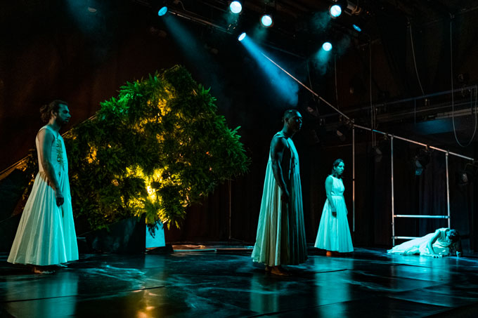 A cenografia do espetáculo, da autoria de Pedro Silva, coloca em palco um espaço delimitado por um chão pintado à mão, que, ora faz lembrar o mármore de uma igreja, ora nos remete para o imenso mar que, tanto poderá significar a via de acesso a um destino feliz ou mais um cemitério de gente. Deste chão, sagrado e mundano, irrompe uma estrutura vertical repleta de vegetação natural, de onde sobressaem verdes exuberantes e que dá origem a um gotejar permanente durante toda a performance, e que é iluminado pelo desenho de luz concebido por Carlos Arroja. Os figurinos são assinados por Catarina Graça e partem do mesmo modelo-base de vestido para todos os intérpretes, com cortes e rasgões diferenciados, que acabarão por sofrer uma alteração cromática ao longo de cada performance.