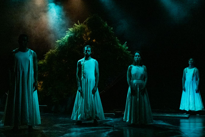 A presença dos quatro atores – Filipe Araújo, Rafael Barreto, João Pedro Leal e Rita Morais -, o dizer do texto, o movimento, a música e a paisagem sonora original construída e interpretada ao vivo pela violinista Maria da Rocha, concorrem para a construção de um lugar de urgência.
